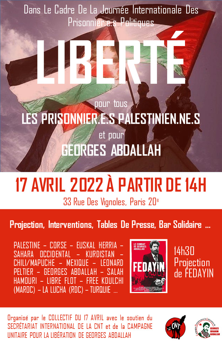 A l’occasion de la journée internationale de solidarité avec les prisonnier.e.r.s politiques, le Collectif du 17 avril, avec le soutien de la CNT (Secrétariat International / CNT éducation 93) et de la Campagne Unitaire pour la Libération de Georges Ibrahim Abdallah, vous invite à une journée de mobilisation ce 17 avril 2022 à partir de 14h au 33 rue des Vignoles, Paris 20°, métro ligne 9 Buzenval ou ligne 2 Avron.