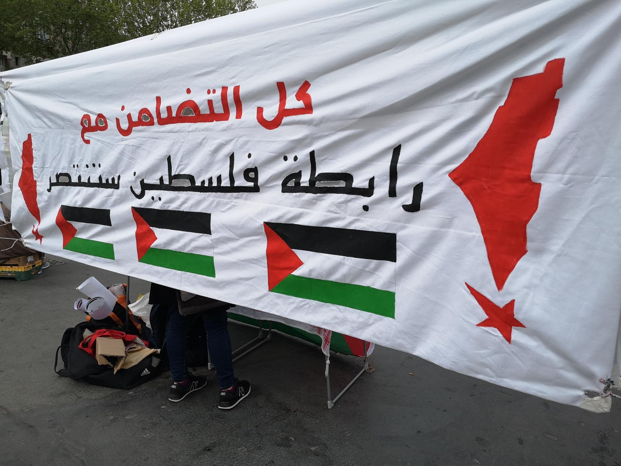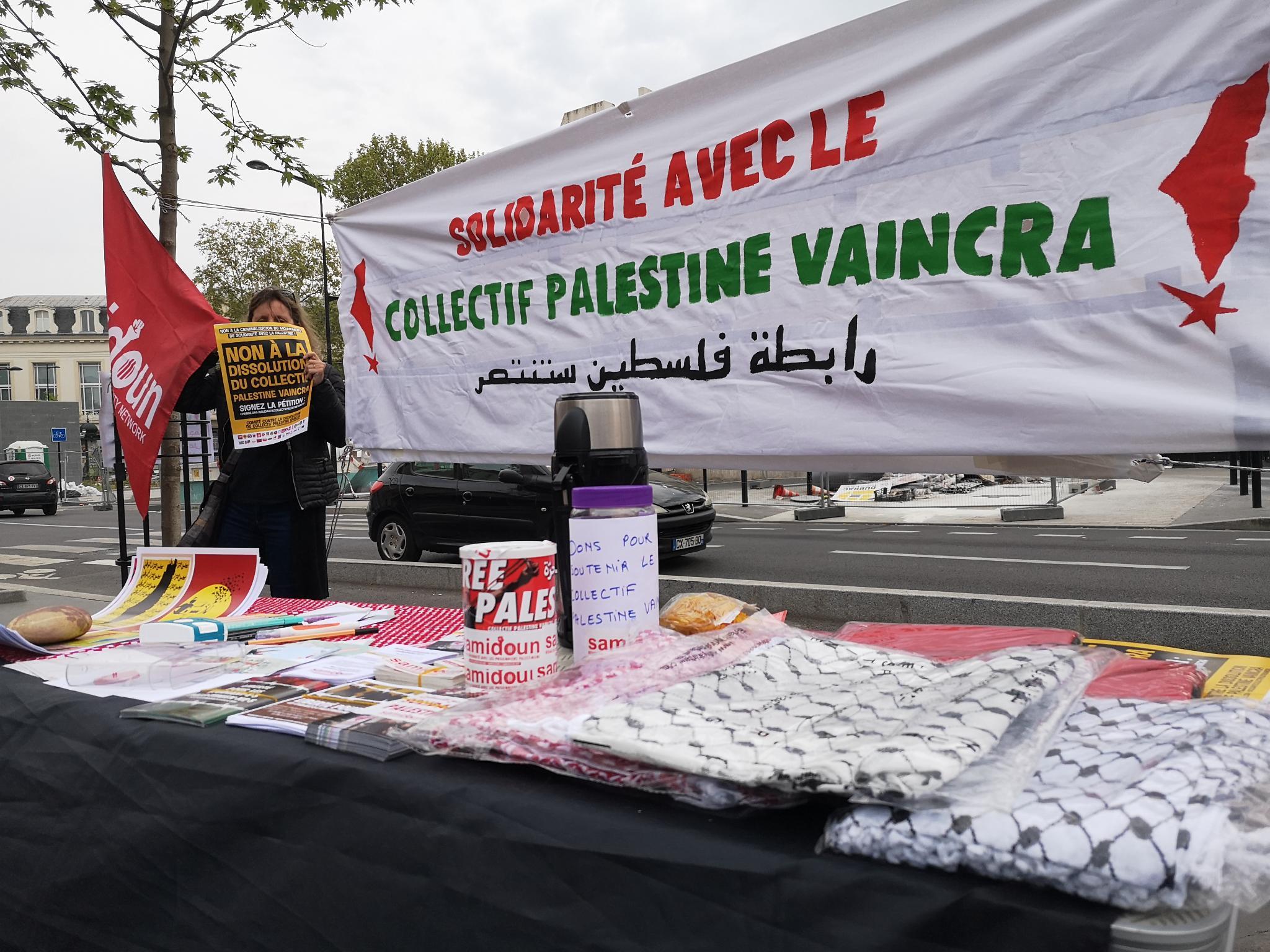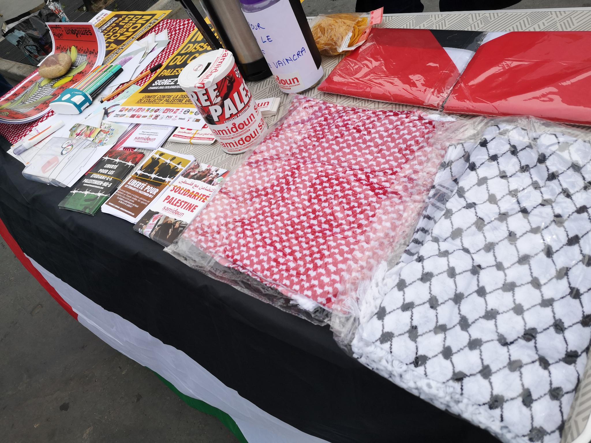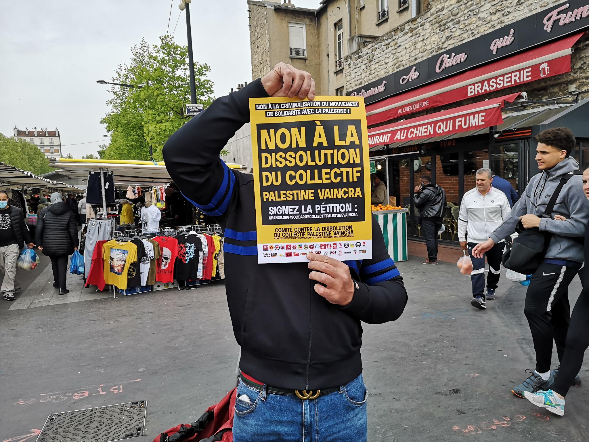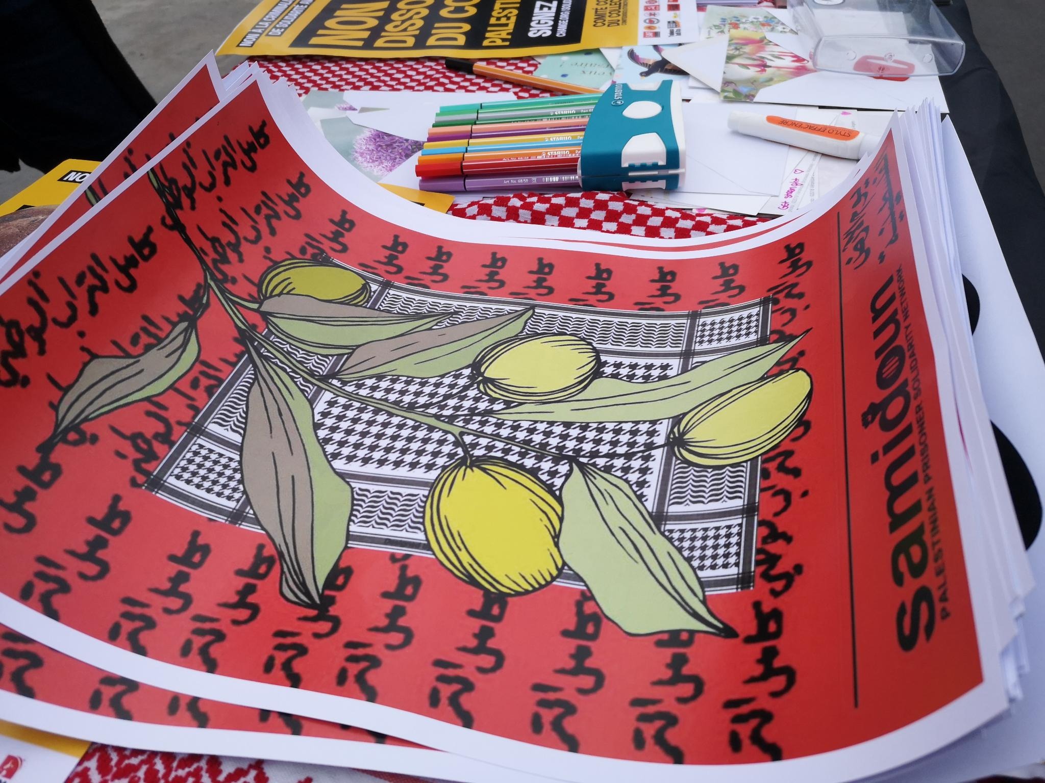 Durant le marché d’Aubervilliers, Samidoun Région Parisienne tenait son stand mensuel ce samedi 24 avril dans le cadre de la Semaine internationale d’actions contre la dissolution du Collectif Palestine Vaincra et en soutien aux prisonnier·e·s palestinien·ne·s.
