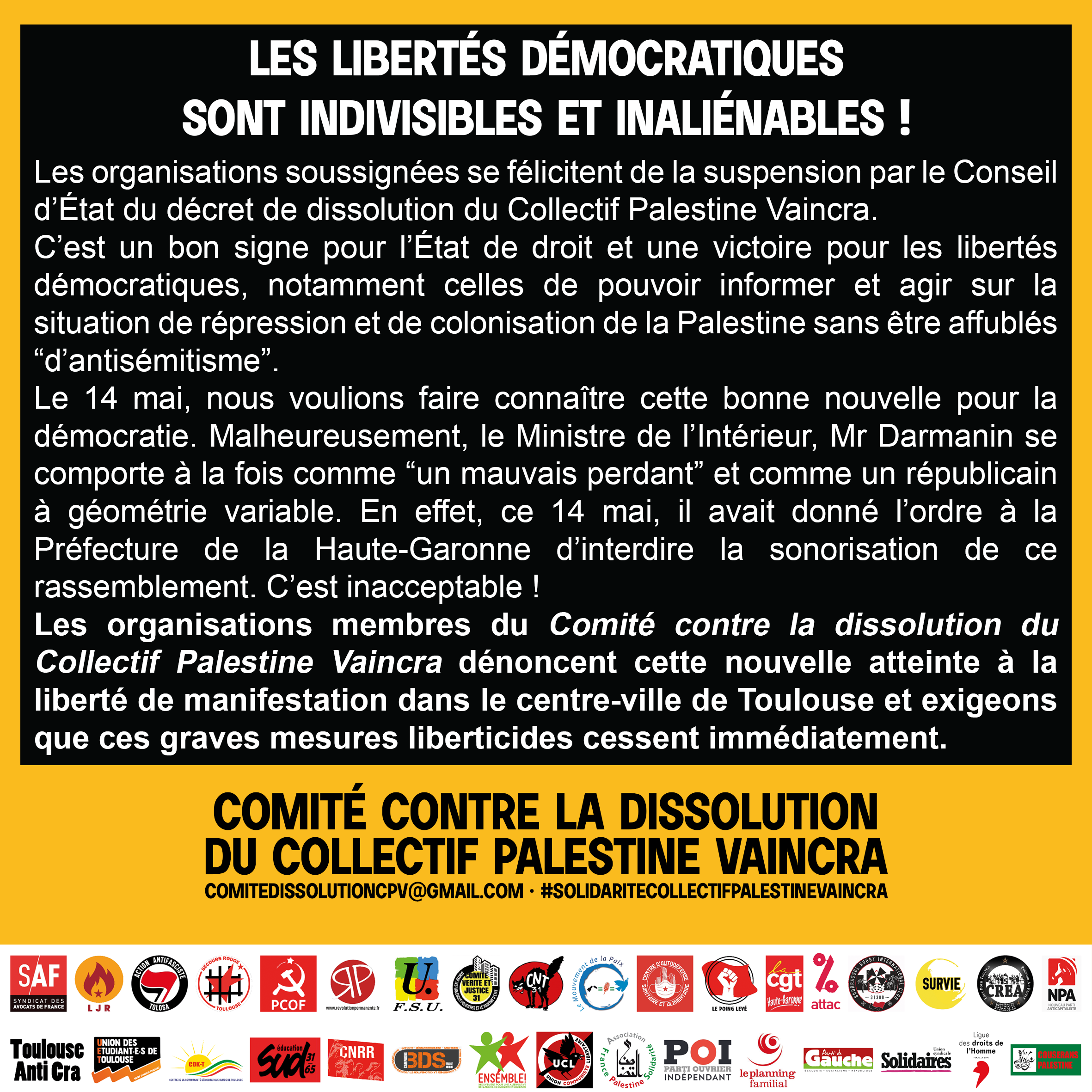 Les organisations membres du Comité contre la dissolution du Collectif Palestine Vaincra dénoncent cette nouvelle atteinte à la liberté de manifestation dans le centre-ville de Toulouse et exigeons que ces graves mesures liberticides cessent immédiatement.