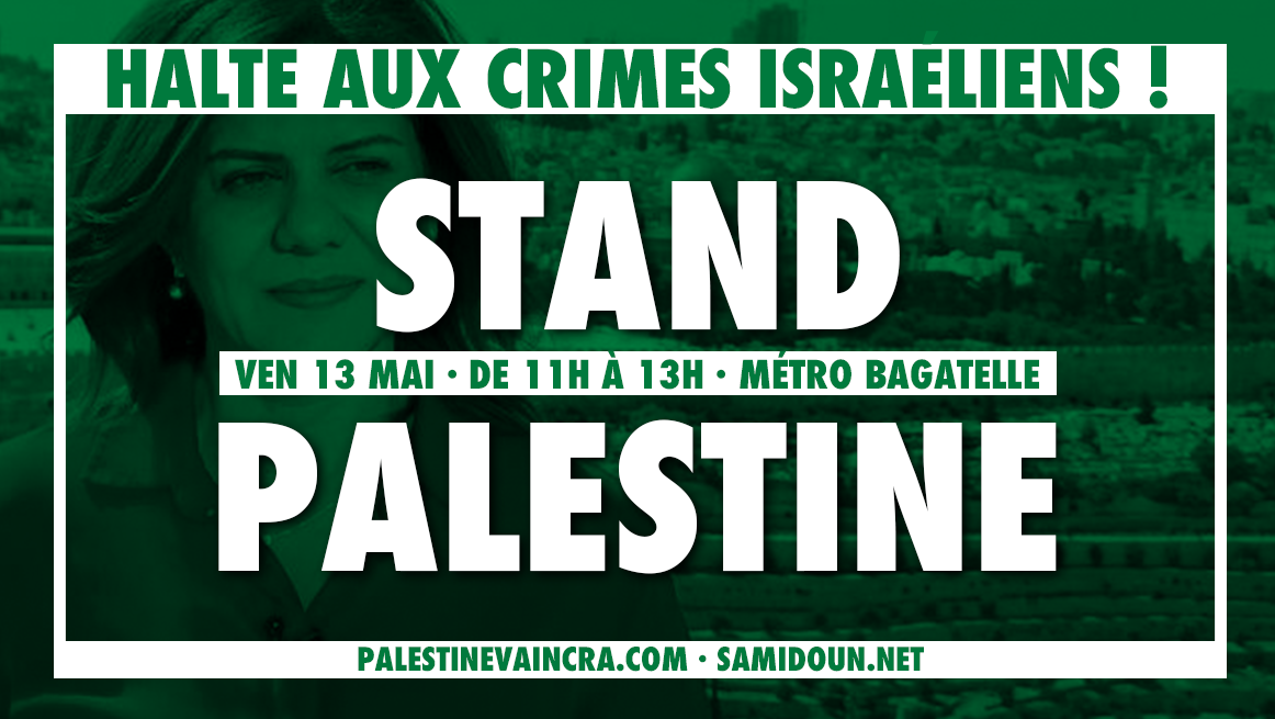 Vendredi 13 mai de 11H à 13H, nous organisons un Stand Palestine à la sortie du métro Bagatelle à Toulouse. À cette occasion, nous rendrons hommage à la journaliste palestinienne Shireen Abu Aqleh assassinée par l’armée israélienne le 11 mai dernier. Depuis 2000, 55 journalistes ont été tués par l’occupation israélienne. Nous devons nous mobiliser pour dénoncer ces crimes et plus largement soutenir le peuple palestinien et sa résistance face au colonialisme et à l’apartheid. Rejoignez-nous lors de ce stand pour affirmer votre solidarité avec la Palestine, récupérer des dépliants et stickers gratuits, faire des photos de solidarité, etc. Par ailleurs, nous inviterons au rassemblement de samedi 14 mai dès 14H à la sortie du métro Capitole pour célébrer la suspension de la dissolution du Collectif Palestine Vaincra.