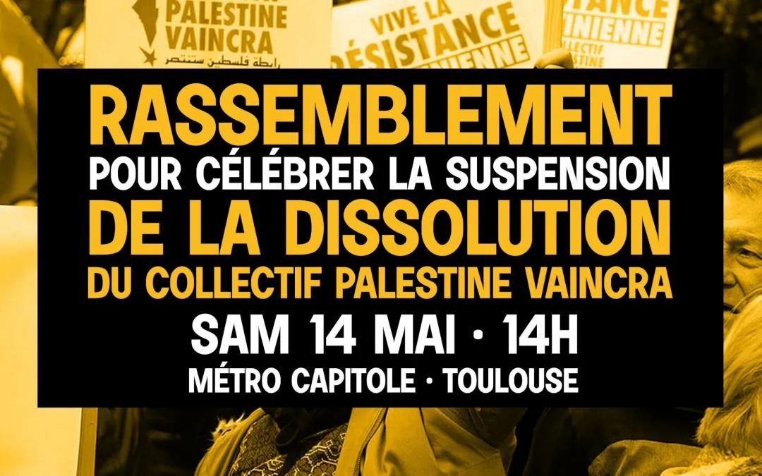 Le Comité contre la dissolution du Collectif Palestine Vaincra appelle à se rassembler samedi 14 mai dès 14H au métro Capitole pour célébrer cette première victoire et réaffirmer notre solidarité avec le peuple palestinien qui continue de faire face à une brutale politique coloniale.