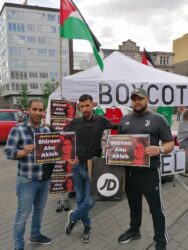 Au stand, on trouvait également des listes avec les produits israéliens à boycotter. L’attention a été attirée sur la réapparition de pommes de terres israéliennes primeurs dans nos grands magasins et des autocollants BDS ont été distribués. Les passants pouvaient également signer la pétition pour l’interdiction des produits des colonies, que vous pouvez signer en ligne ICI.