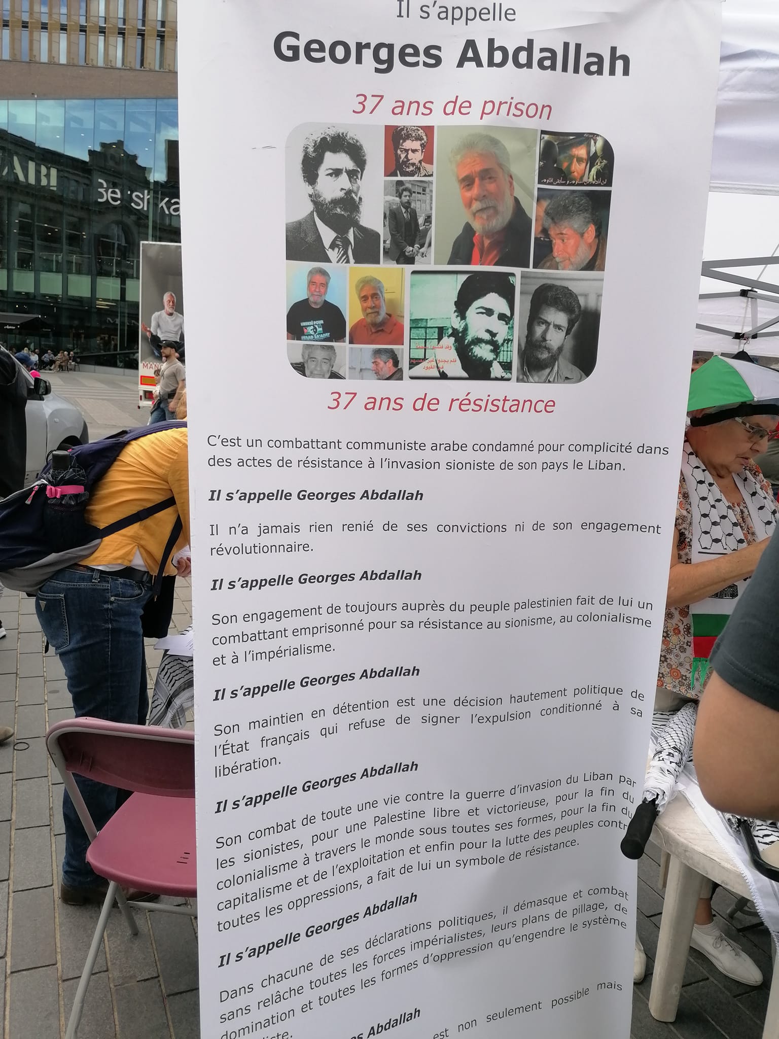 Un roll-up pour la libération de Georges Ibrahim Abdallah a été déployé. C’était l’occasion aussi pour un membre de la Plate-forme d’expliquer sa visite récente à Georges dans la prison de Lannemezan. La détention de Georges Abdallah est avant tout politique et le gouvernement français n’est pas près de le relâcher. Il nous faudra redoubler d’efforts pour faire connaître sa cause dans chaque lutte à laquelle nous participons.