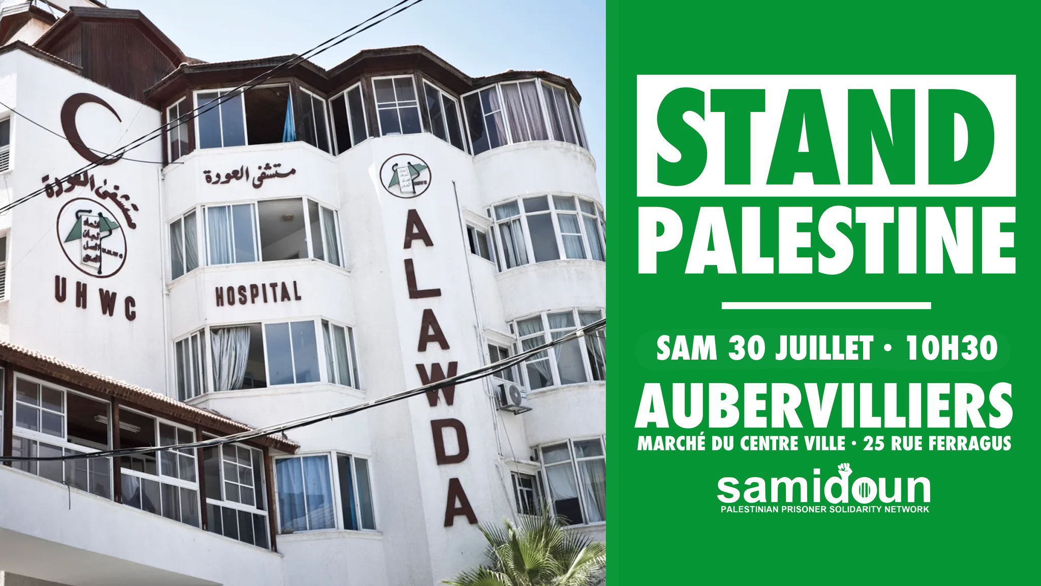Samedi 30 juillet de 10H30 à 12H30, Samidoun Région Parisienne vous invite à participer à un stand Palestine au marché du centre-ville d’Aubervilliers (25 rue Ferragus, métro Mairie d’Aubervilliers)