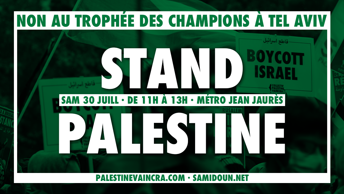 Samedi 30 juillet de 11H à 13H, nous organisons un Stand Palestine à la sortie du métro Jean Jaurès à Toulouse dans le cadre de la campagne contre la tenue du Trophée des Champions à Tel Aviv. Ce match opposera le PSG et le FC Nantes le dimanche 31 juillet dans la capitale de l’apartheid à l’occasion d’une opération de promotion de l’occupation israélienne.