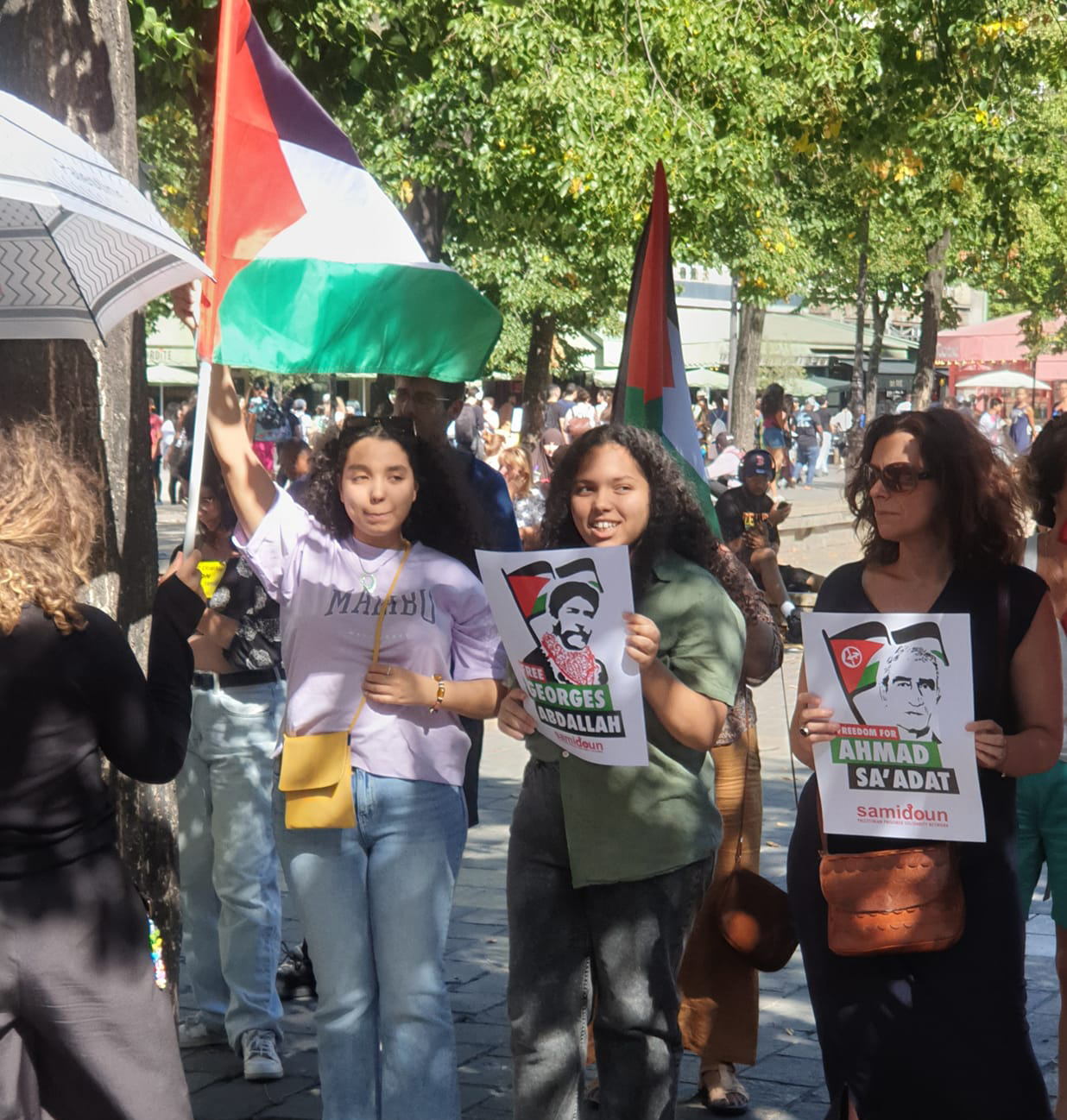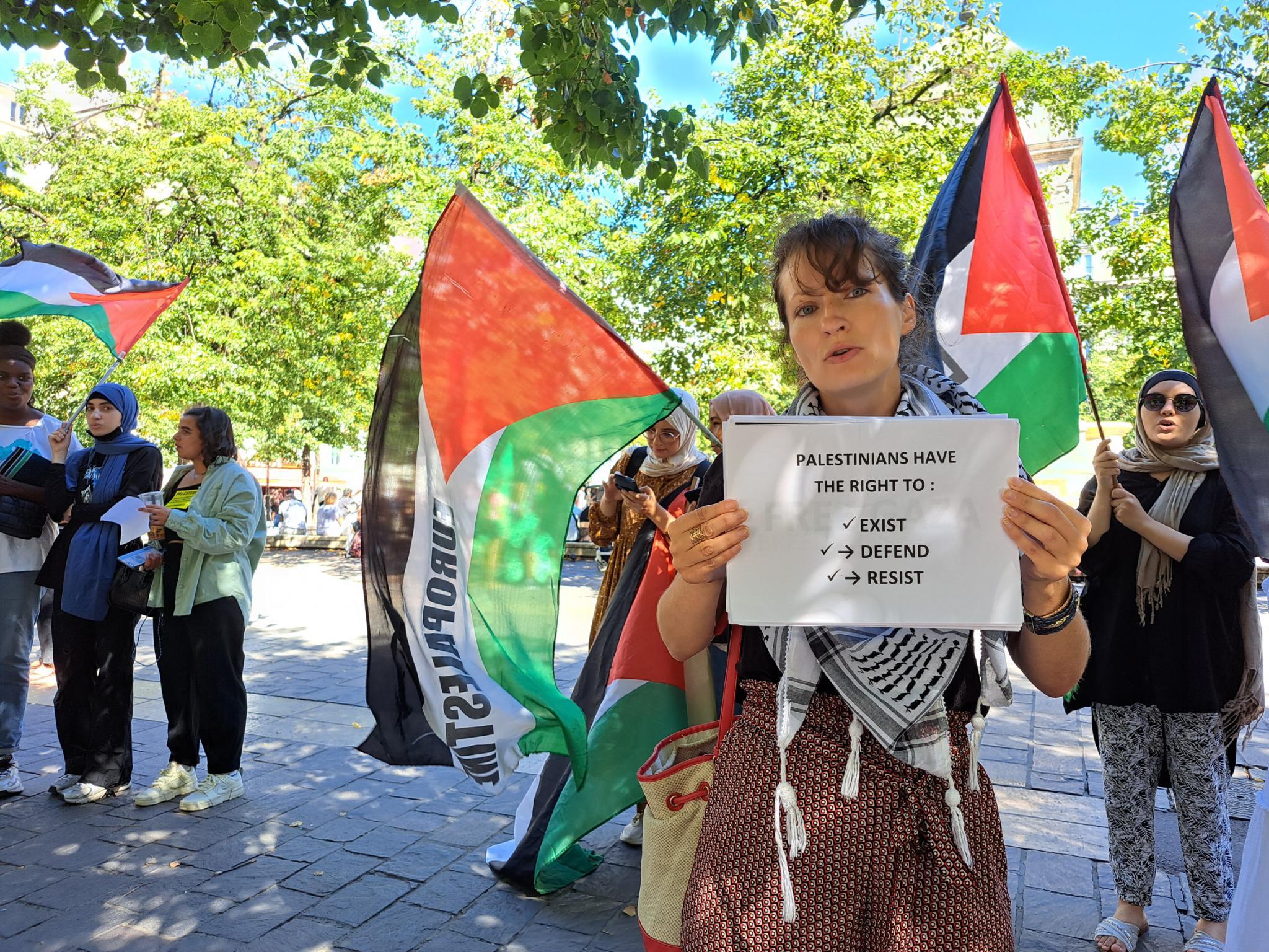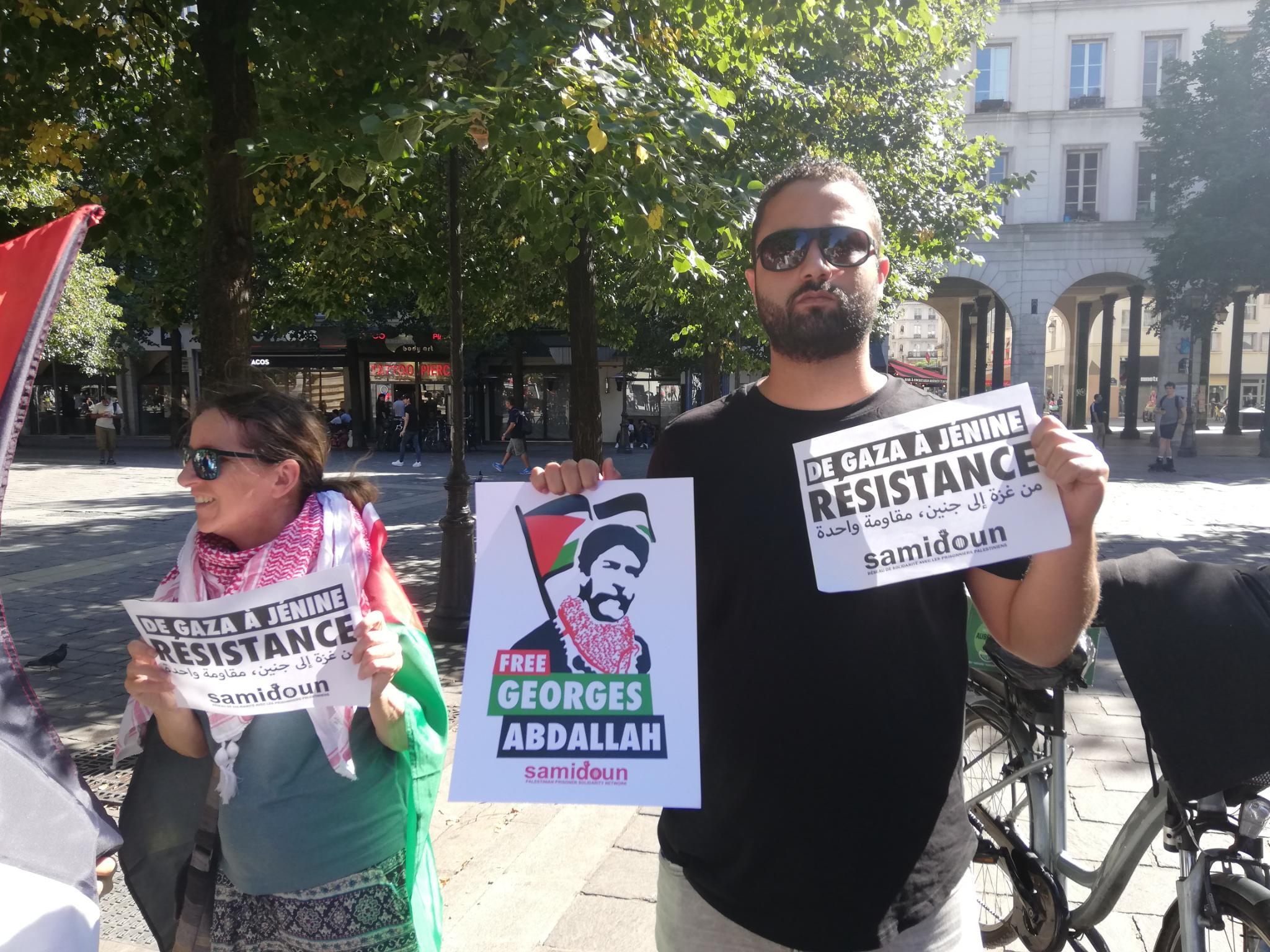 Les manifestant·e·s ont affirmé leur solidarité avec les Palestinien·ne·s en rappelant leur droit à exister et résister et ont rappelé la réalité à laquelle ces derniers font face depuis plus de 75 ans : la colonisation, le vol de leurs terres et de leurs maisons, la terreur militaire et la violence, les emprisonnements arbitraires, l’apartheid. Des pancartes de soutien ont été brandies pour la libération des prisonniers politiques palestiniens, notamment Georges Ibrahim Abdallah, communiste libanais emprisonné injustement en France à Lannemezan (65), et Ahmad Sa’adat, secrétaire général du FPLP emprisonné dans la prison israélienne de Ramon.