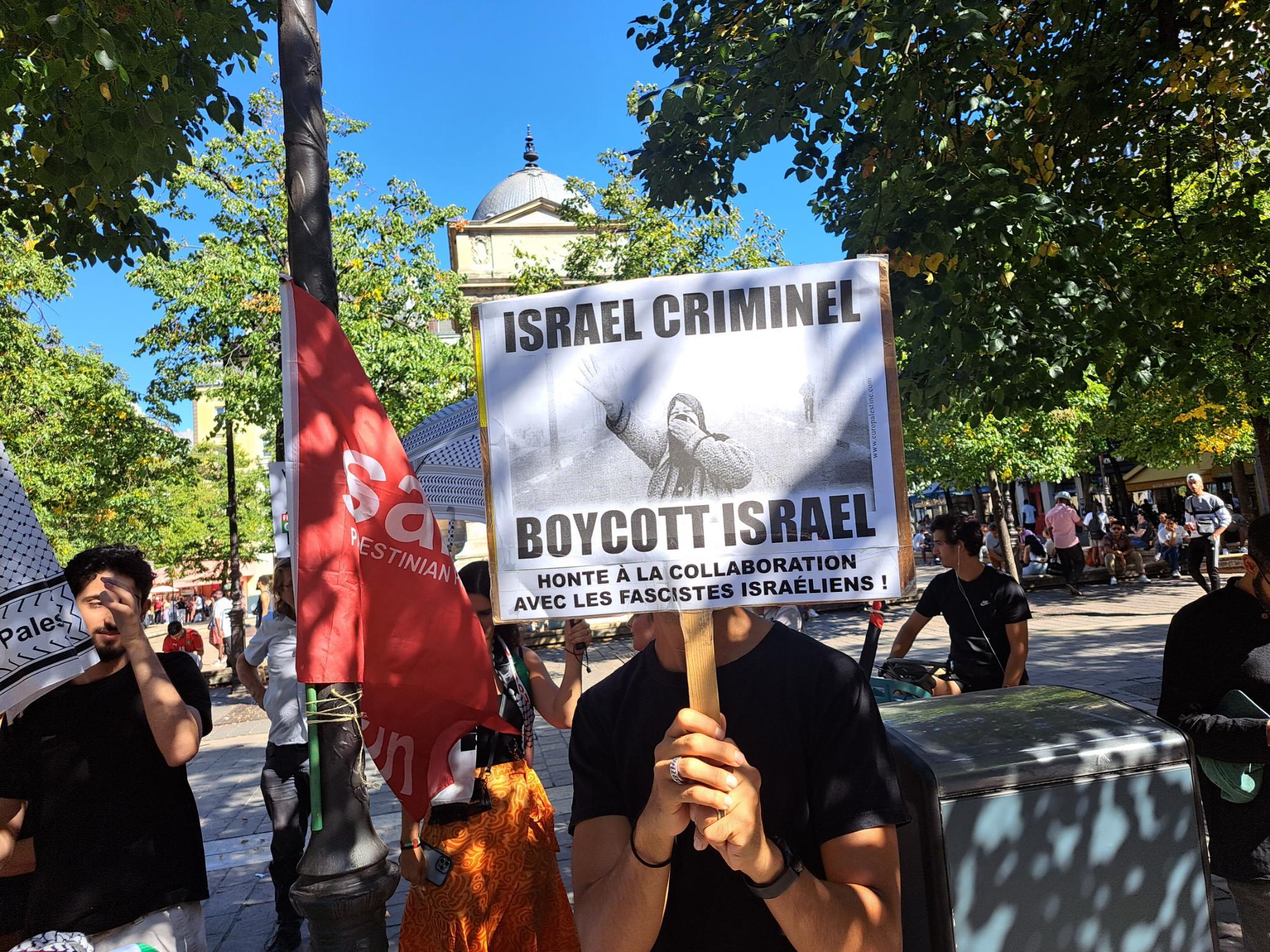 Les manifestant·e·s ont rappelé le rôle du boycott comme outil de résistance contre l’État terroriste d’Israël et de solidarité avec le peuple palestinien.