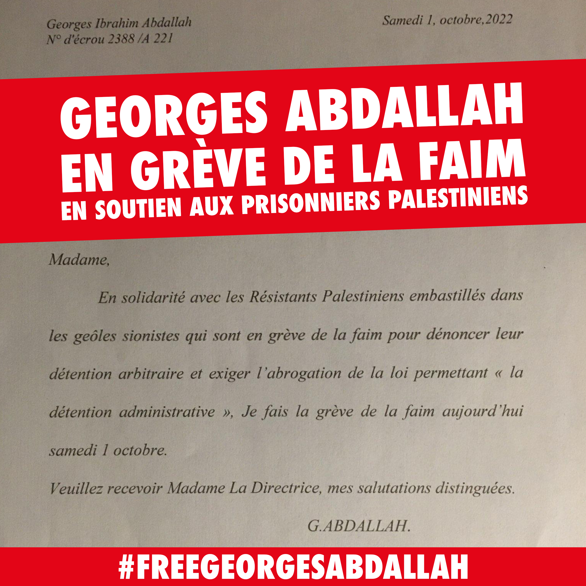 Depuis le 25 septembre, 30 prisonniers palestiniens emprisonnés sans inculpation ni procès dans le cadre de la « détention administrative » ont entamé une grève de la faim pour exiger la fin de cette politique, qui emprisonne actuellement plus de 740 prisonniers palestiniens en vertu de « preuves secrètes ». Samedi 1er octobre, le militant communiste libanais Georges Abdallah a annoncé faire une journée de grève de la faim en solidarité avec cette mobilisation exemplaire. Dans un courrier adressé à la directrice du Centre Pénitentiaire de Lannemezan, il a déclaré : « En solidarité avec les Résistants Palestiniens embastillés dans les geôles sionistes qui sont en grève de la faim pour dénoncer leur détention arbitraire et exiger l’abrogation de la loi permettant ‘la détention administrative’, je fais la grève de la faim aujourd’hui 1er octobre ».