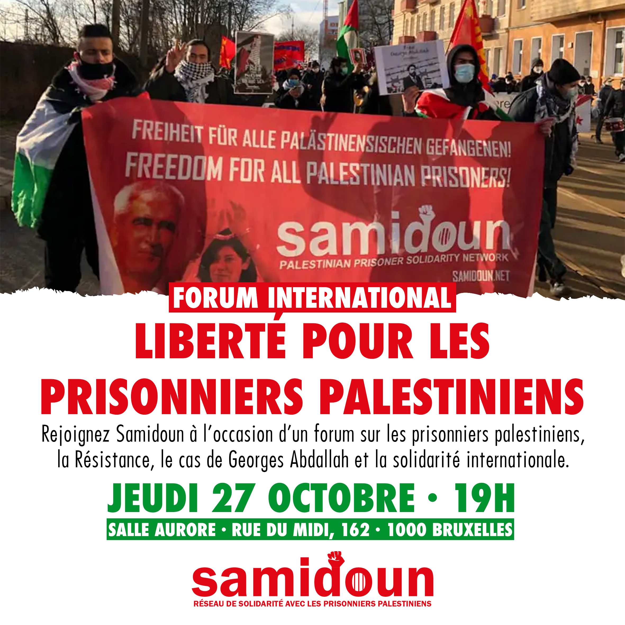 Dans le cadre de la Semaine d’action pour la libération de la Palestine qui a lieu à Bruxelles, le réseau international Samidoun organise un forum international sur les prisonniers palestiniens, la Résistance et l’importance de la solidarité internationale ce jeudi 27 octobre dès 19H à la Salle Aurore à Bruxelles. Aux côtés de différents intervenants, le Collectif Palestine Vaincra interviendra sur Georges Abdallah, le sens de son engagement et l’importance de le soutenir. Samedi 29 octobre dès 14H, la semaine se clôturera par la Marche pour le Retour et la Libération de la Palestine organisée par Masar Badil avec le soutien de nombreuses organisations palestiniennes, arabes et internationales.
