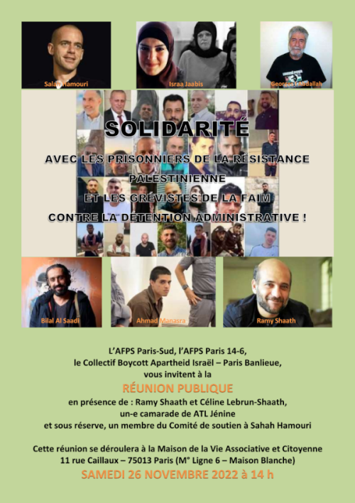 L’AFPS Paris-Sud, l’AFPS Paris 14-6, l’AFPS Gentilly, le Collectif Boycott Apartheid Israël – Paris Banlieue et Forum Palestine Citoyenneté vous invitent à une réunion publique de soutien aux prisonniers palestiniens où interviendront :