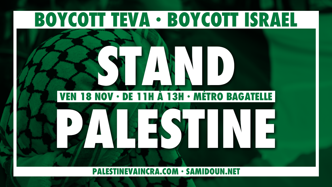 Rejoignez-nous lors de ce stand pour récupérer des vignettes gratuites “boycott TEVA” à disposer sur votre carte vitale, faire des photos de solidarité, discuter de la situation en Palestine, etc.
