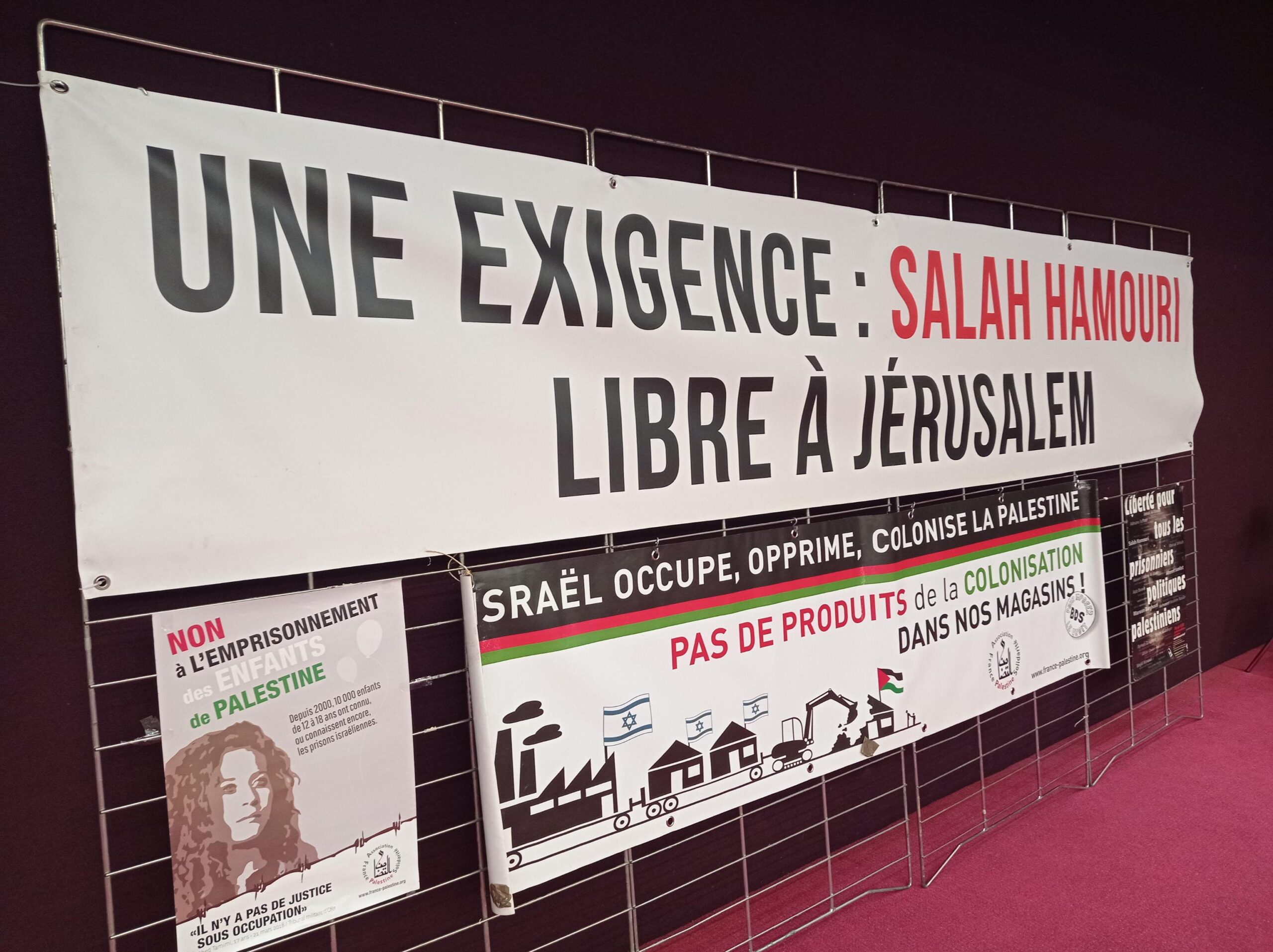 Salah Hamouri a commencé son intervention en racontant les détails de son arrestation et de son incarcération, à Ofer dans une cellule où étaient également détenus deux hommes âgés de plus de 75 ans. Il est revenu sur la grève de la faim collective et le boycott massif des tribunaux militaires à laquelle il a participé aux côtés de plusieurs autres détenus administratifs. Il a aussi évoqué le sort des 150 enfants et adolescents palestiniens enfermés dans les geôles sionistes et a rendu hommage aux martyrs du mouvement des prisonniers, ces detenu·es décédé·es des suites de la négligence médicale intentionnelle mise en œuvre dans les prisons coloniales.