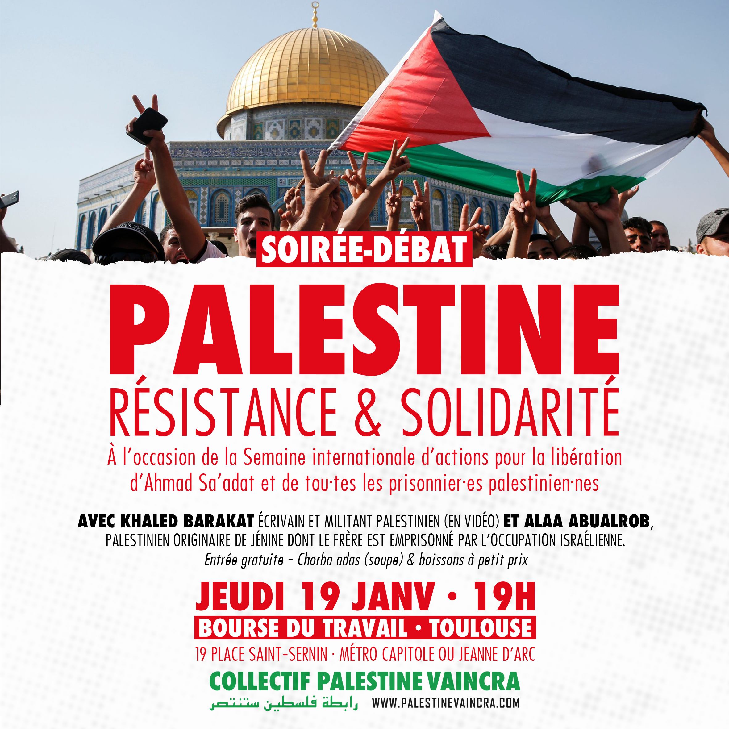 Jeudi 19 janvier dès 19h, le Collectif Palestine Vaincra vous invite à une soirée “Palestine : résistance & solidarité” à la Bourse du Travail (19 place Saint Sernin – métro Capitole ou Jeanne d’Arc- Toulouse)