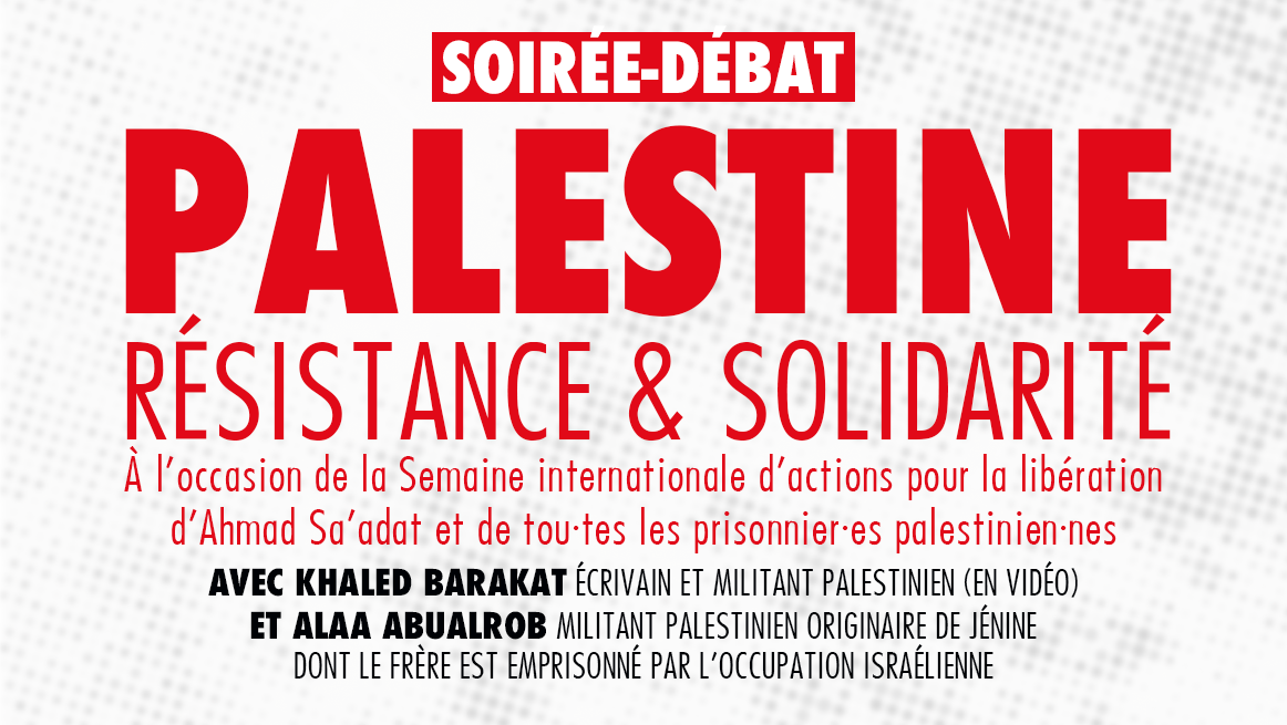 Durant cette soirée-débat, nous aurons l’occasion d’échanger sur la situation en Palestine, le cas d’Ahmad Sa’adat et la solidarité avec les prisonnier·es palestinien·nes. Notamment, nous aurons le plaisir d’écouter l’intervention du militant palestinien Khaled Barakat sur la situation actuelle en Palestine et le mouvement des prisonnier·es ainsi que Alaa Abualrob, Palestinien originaire de Jénine dont le frère est emprisonné par l’occupation israélienne.