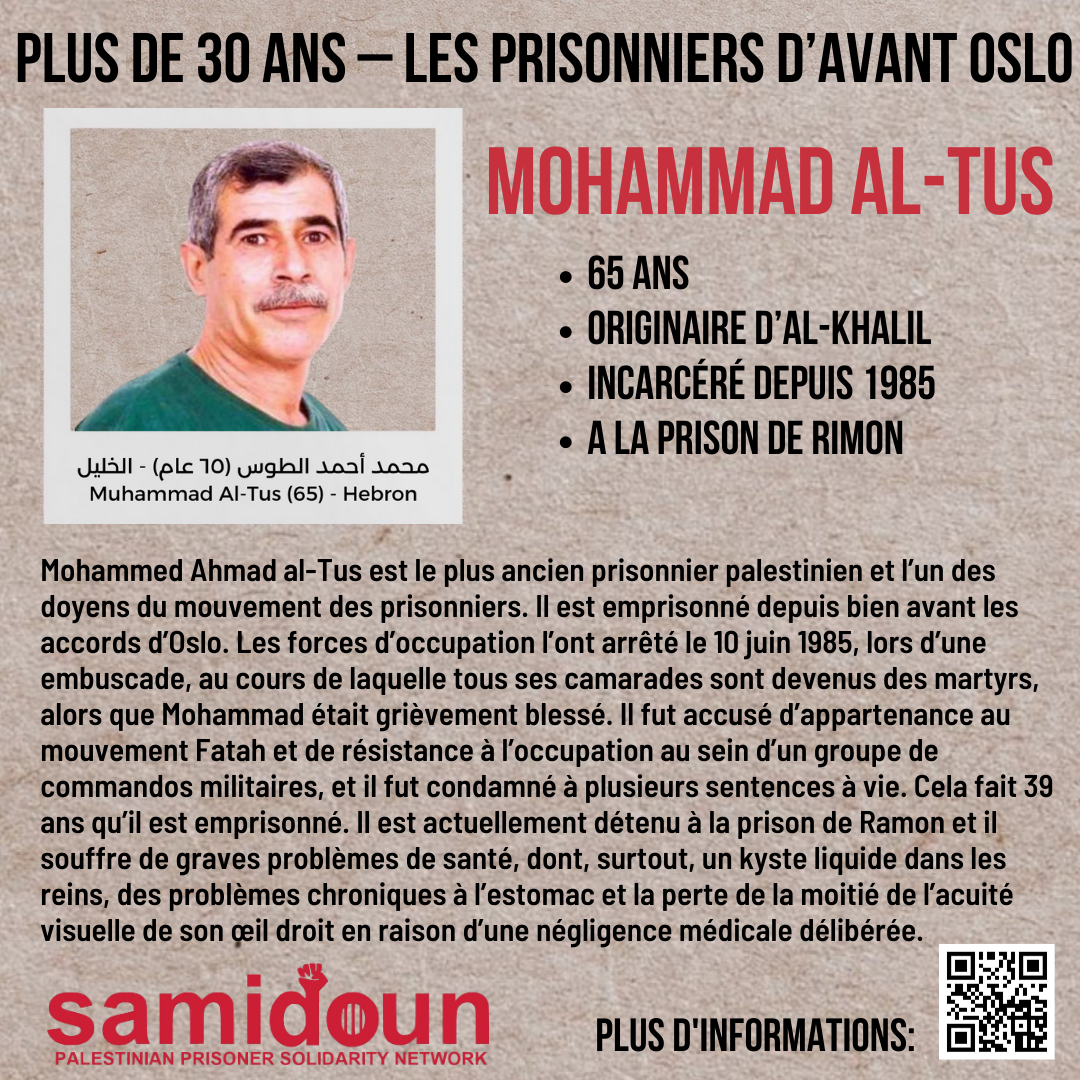 Mohammed Ahmad al-Tus est le plus ancien prisonnier palestinien et l’un des doyens du mouvement des prisonniers. Il est emprisonné depuis bien avant les accords d’Oslo. Les forces d’occupation l’ont arrêté le 10 juin 1985, lors d’une embuscade, au cours de laquelle tous ses camarades sont devenus des martyrs, alors que Mohammad était grièvement blessé. Il fut accusé d’appartenance au mouvement Fatah et de résistance à l’occupation au sein d’un groupe de commandos militaires, et il fut condamné à plusieurs sentences à vie. Cela fait 39 ans qu’il est emprisonné. Il est actuellement détenu à la prison de Ramon et il souffre de graves problèmes de santé, dont, surtout, un kyste liquide dans les reins, des problèmes chroniques à l’estomac et la perte de la moitié de l’acuité visuelle de son œil droit en raison d’une négligence médicale délibérée.