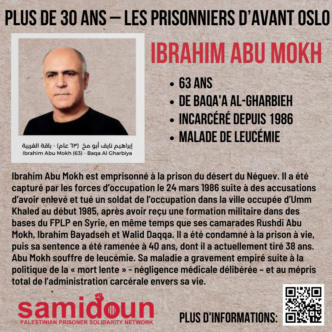 Ibrahim Abu Mokh est emprisonné à la prison du désert du Néguev. Il a été capturé par les forces d’occupation le 24 mars 1986 suite à des accusations d’avoir enlevé et tué un soldat de l’occupation dans la ville occupée d’Umm Khaled au début 1985, après avoir reçu une formation militaire dans des bases du FPLP en Syrie, en même temps que ses camarades Rushdi Abu Mokh, Ibrahim Bayadseh et Walid Daqqa. Il a été condamné à la prison à vie, puis sa sentence a été ramenée à 40 ans, dont il a actuellement tiré 38 ans. Abu Mokh souffre de leucémie. Sa maladie a gravement empiré suite à la politique de la « mort lente » – négligence médicale délibérée – et au mépris total de l’administration carcérale envers sa vie.