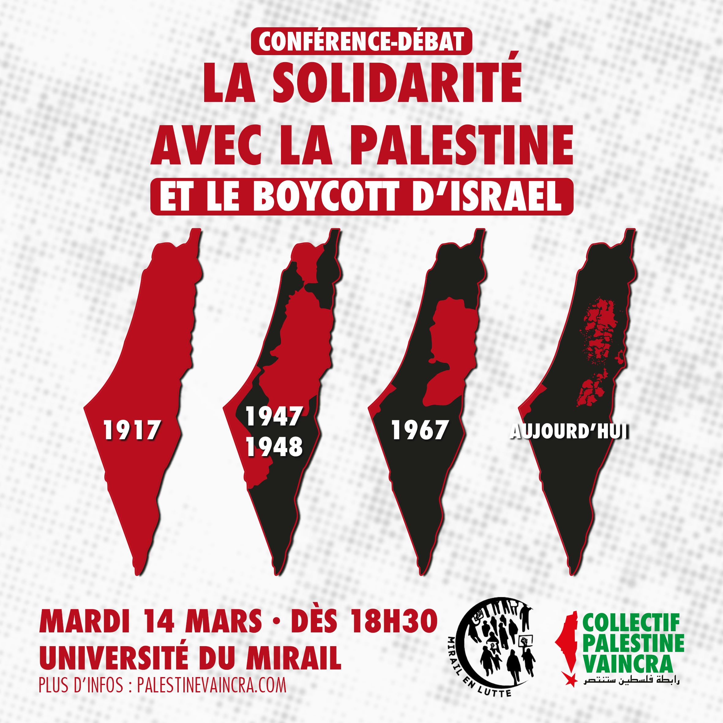 Mardi 14 mars dès 18H30 au bâtiment du Gai Savoir de l’Université Toulouse Jean Jaurès, le Comité de lutte du Mirail invite le Collectif Palestine Vaincra à animer une conférence-débat sur la solidarité avec la Palestine et le boycott d’Israël.