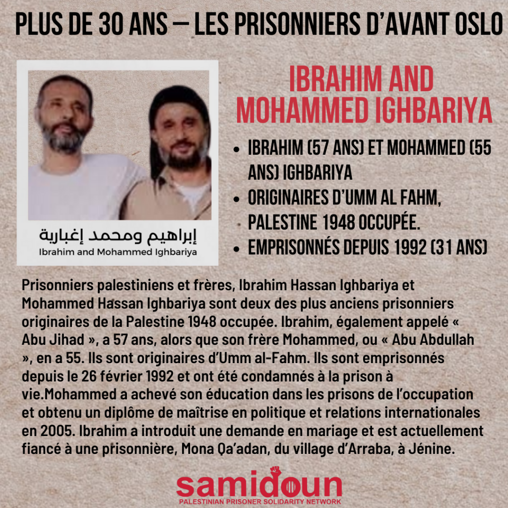 Prisonniers palestiniens et frères, Ibrahim Hassan Ighbariya et Mohammed Hassan Ighbariya sont deux des plus anciens prisonniers originaires de la Palestine 1948 occupée. Ibrahim, également appelé « Abu Jihad », a 57 ans, alors que son frère Mohammed, ou « Abu Abdullah », en a 55. Ils sont originaires d’Umm al-Fahm. Ils sont emprisonnés depuis le 26 février 1992 et ont été condamnés à la prison à vie après avoir été accusés d’avoir mené une opération de résistance dans un camp militaire de l’occupation, opération qui s’était soldée par la mort de trois soldats de l’occupation. Ils avaient été arrêtés quinze jours plus tard en compagnie de Yahya Ighbariya, emprisonné lui aussi.