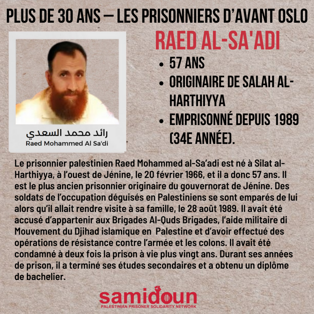 Le prisonnier palestinien Raed Mohammed al-Sa’adi est né à Silat al-Harthiyya, à l’ouest de Jénine, le 20 février 1966, et il a donc 57 ans. Il est le plus ancien prisonnier originaire du gouvernorat de Jénine. Il a été arrêté pour la première fois alors qu’il avait 18 ans, en 1984, et emprisonné pour six mois pour avoir hissé le drapeau israélien au sommet des poteaux électriques à Silat al-Harthiyya.