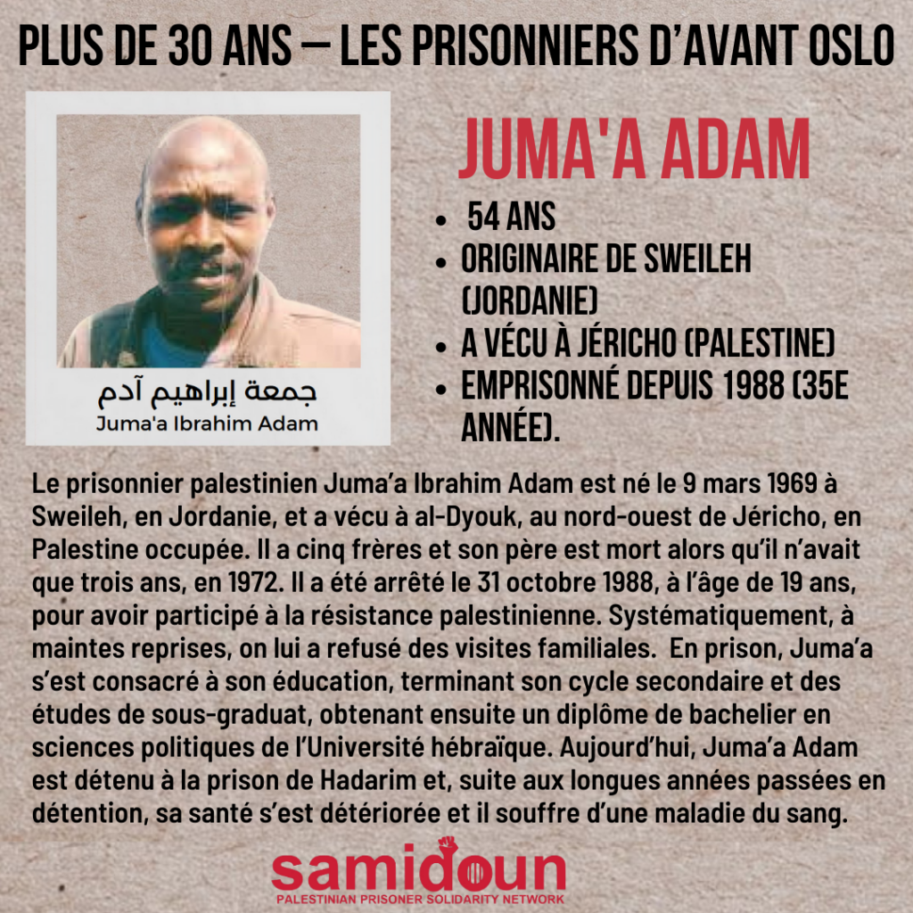 Le prisonnier palestinien Juma’a Ibrahim Adam est né le 9 mars 1969 à Sweileh, en Jordanie, et a vécu à al-Dyouk, au nord-ouest de Jéricho, en Palestine occupée. Il a cinq frères et son père est mort alors qu’il n’avait que trois ans, en 1972. Alors qu’il était en prison sous l’occupation israélienne, il a perdu sa mère et l’administration carcérale ne l’avait pas autorisé de la voir dans ses derniers moments ni d’assister à ses funérailles. « La situation la plus difficile et la plus pénible que j’aie connue durant tout la période de mon emprisonnement a été le décès de ma mère », dit-il.