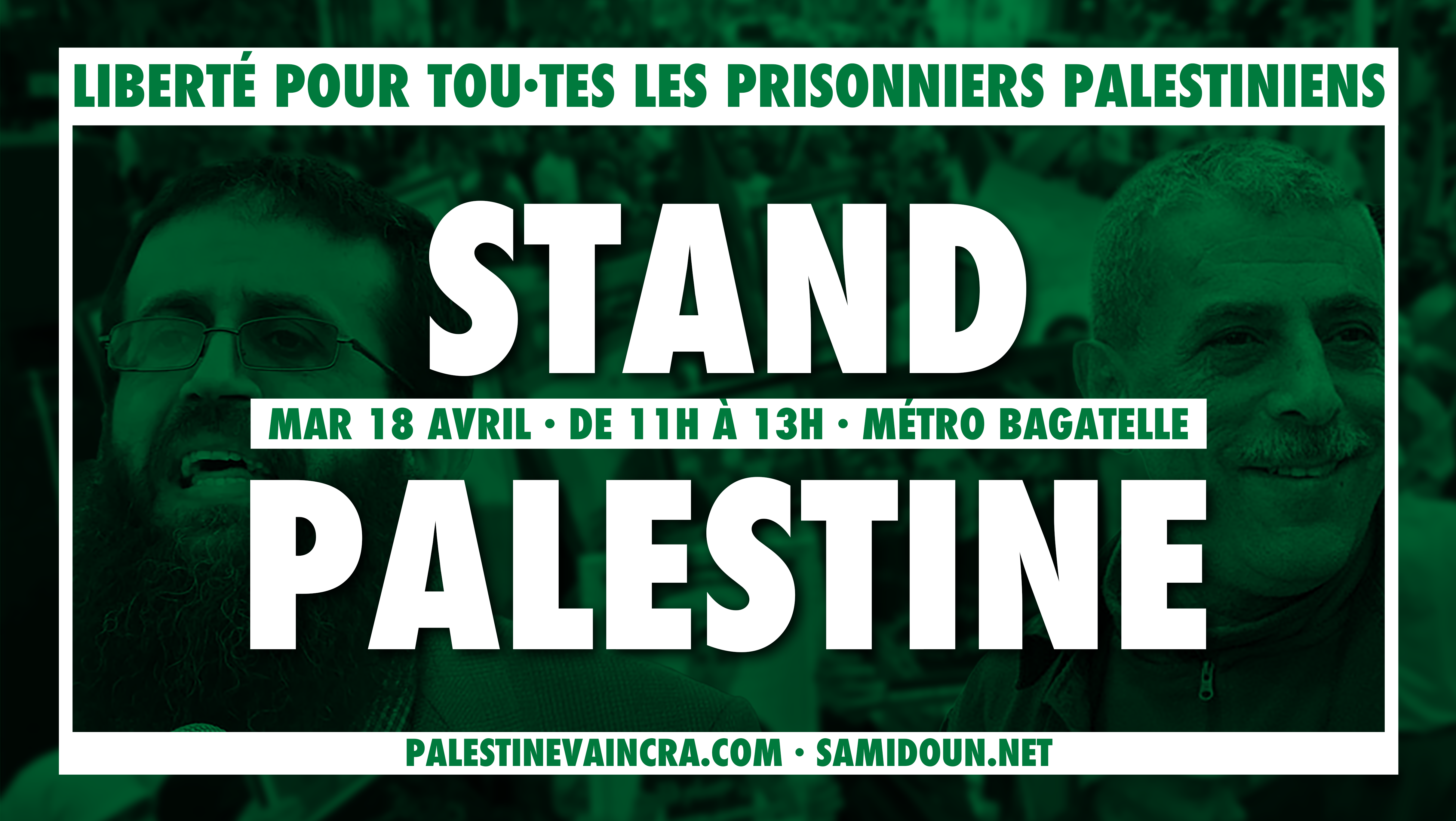 Mardi 18 avril de 11H à 13H, nous organisons un Stand Palestine à la sortie du métro Bagatelle à Toulouse dans le cadre des mobilisations autour de la Journée internationale de soutien aux prisonnier·es palestinien·nes du 17 avril. Aujourd’hui, 4900 Palestinien·nes sont emprisonné·es dans les prisons de l’occupation israélienne, dont 1016 en détention administrative (sans charge ni procès). Parmi eux, Khader Adnan est en grève de la faim depuis près de 70 jours contre son emprisonnement arbitraire. Parallèlement, l’intellectuel et révolutionnaire palestinien Walid Daqqah lutte contre une grave maladie alors qu’il est emprisonné depuis 1986 et victime de la politique de négligence médicale des autorités pénitentiaires. Sans oublier le sort réservé à Georges Abdallah, combattant de la résistance palestinienne emprisonné en France depuis 1984, ou encore aux trois Palestiniens de la Holy Land Foundation emprisonnés aux États-Unis sous des prétextes fallacieux.