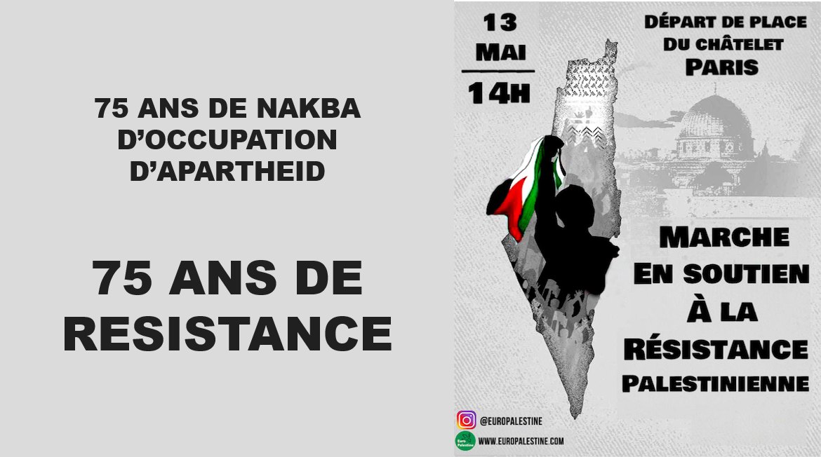 A l’initiative de CAPJPO-Europalestine, une marche est organisée à Paris en soutien à la résistance palestinienne à l’occasion du 75e anniversaire de la Nakba. Aux côtés de plusieurs organisations, Samidoun Paris Banlieue soutient cette initiative et appelle à y participer largement. Voir l’appel ci-dessous :