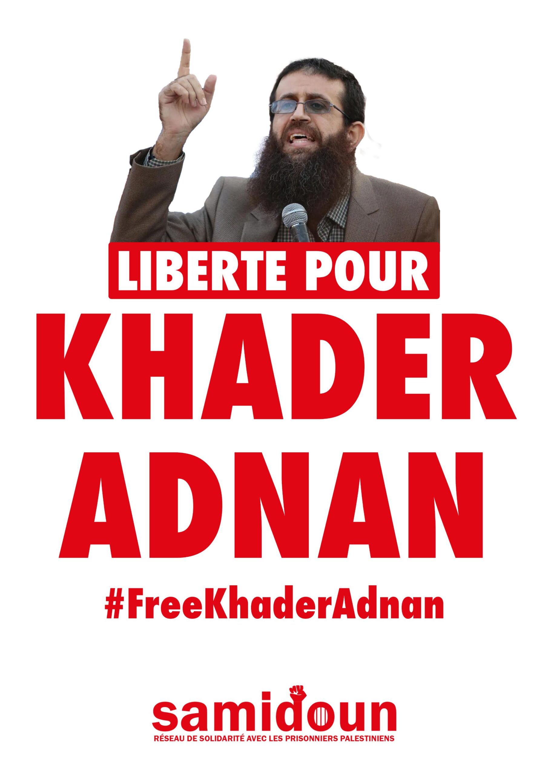 Le réseau de solidarité avec les prisonniers palestiniens Samidoun souligne qu’il est urgent de mener une action internationale, de déployer des efforts médiatiques, d’organiser des manifestations populaires et de se mobiliser pour sauver la vie de Khader Adnan et gagner sa liberté, ainsi que celle de ses compagnons prisonniers politiques. Il résiste avec tout ce qui est à sa disposition derrière les barreaux, mettant son corps et sa vie en jeu pour la liberté. L’occupation sioniste et son administration pénitentiaire sont entièrement responsables de sa situation actuelle et de toute nouvelle détérioration ou menace pour sa vie et sa santé. Nous notons que les gouvernements américain, européen, britannique, canadien et autres qui continuent à fournir un soutien militaire, économique et diplomatique au régime d’occupation israélien sont complices des crimes en cours contre le peuple palestinien, les prisonniers palestiniens et Khader Adnan en particulier.