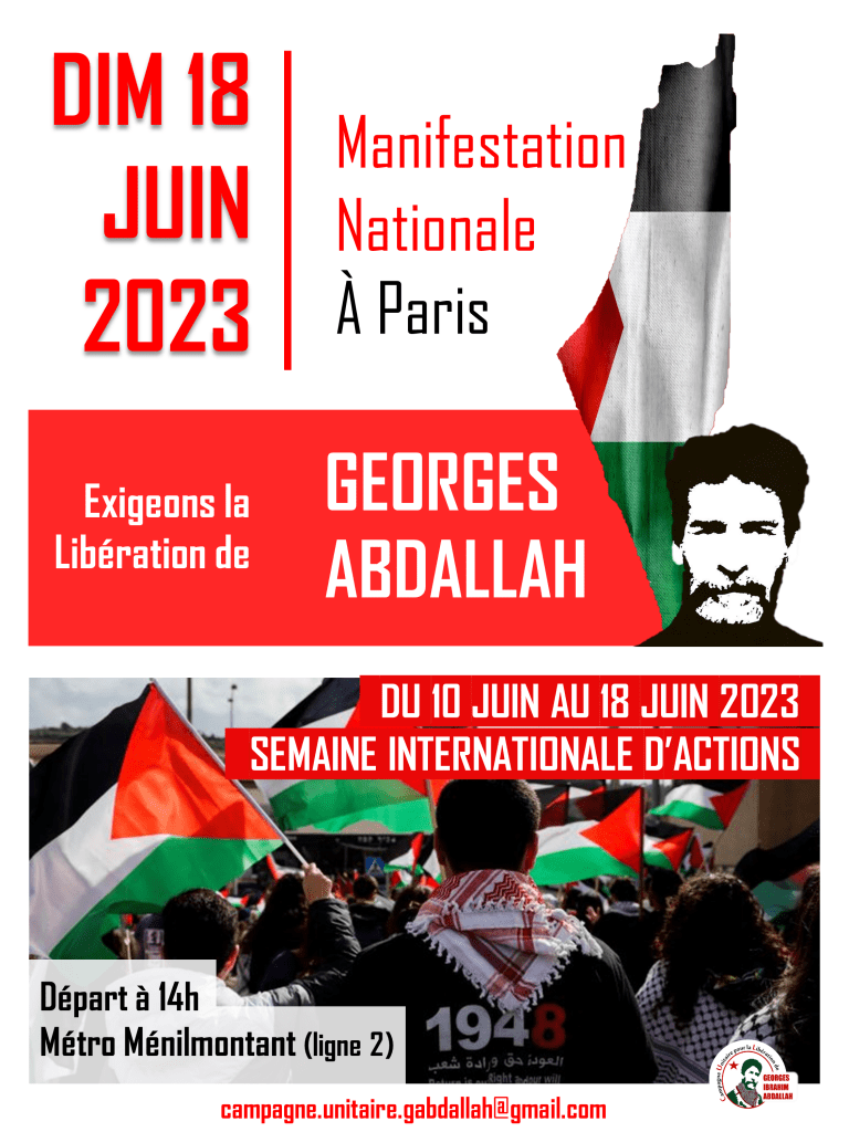 Le 18 juin prochain, veille de la journée internationale des prisonniers révolutionnaires, nous appelons à une nouvelle grande manifestation nationale pour la libération de l’un d’entre eux : Georges Abdallah, ce combattant de toute une vie pour une Palestine libérée de l’occupant sioniste mais aussi pleinement révolutionnaire par son soutien indéfectible aux luttes des peuples contre l’impérialisme, le capitalisme, le fascisme et toutes les formes de réaction.