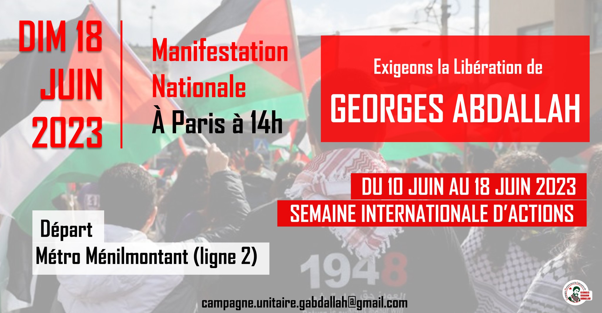 Le 18 juin prochain, veille de la journée internationale des prisonniers révolutionnaires, nous appelons à une nouvelle grande manifestation nationale pour la libération de l’un d’entre eux : Georges Abdallah, ce combattant de toute une vie pour une Palestine libérée de l’occupant sioniste mais aussi pleinement révolutionnaire par son soutien indéfectible aux luttes des peuples contre l’impérialisme, le capitalisme, le fascisme et toutes les formes de réaction.