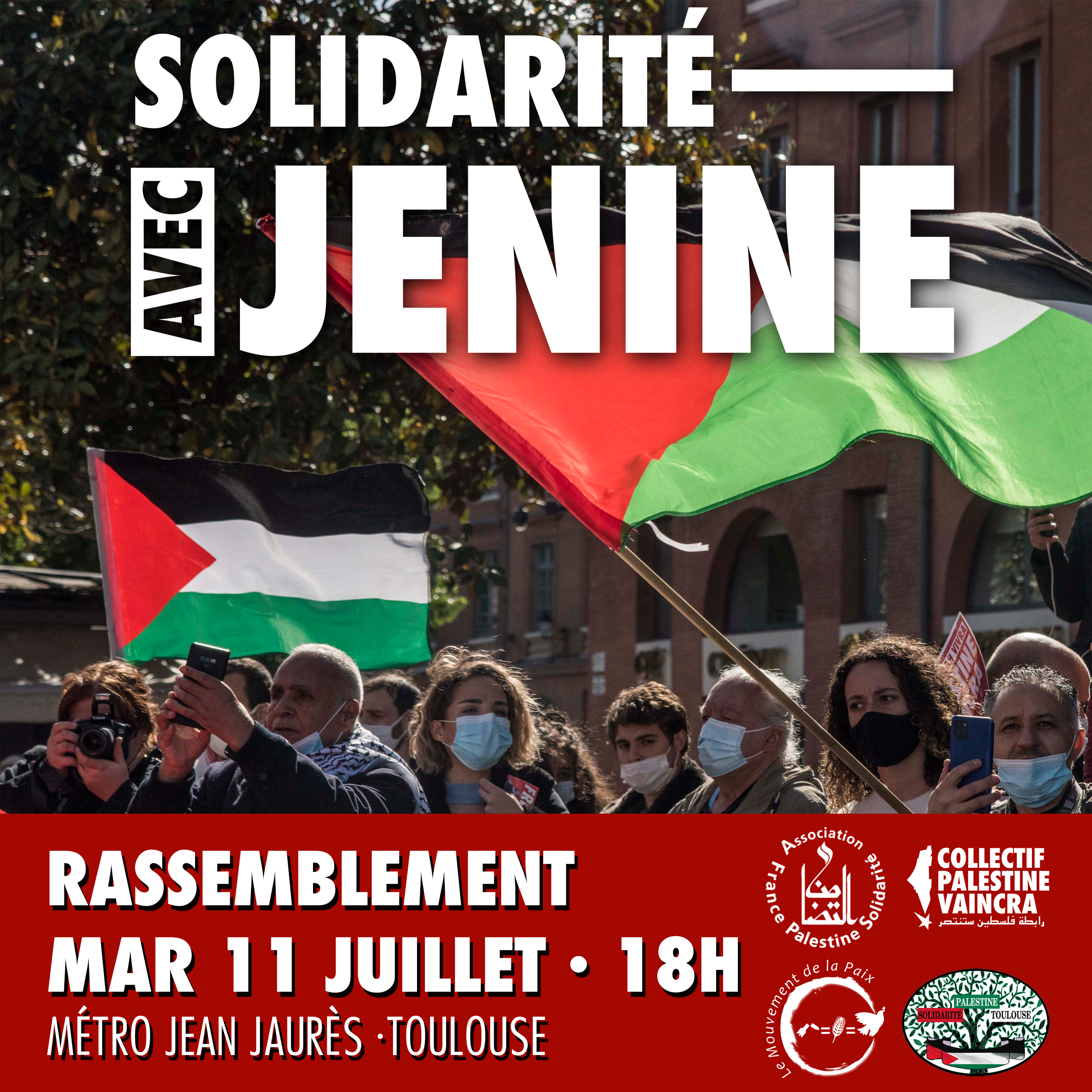 Lundi 3 juillet, l’occupation israélienne a lancé sa plus grande offensive militaire contre Jénine depuis 20 ans, incluant plus de 150 véhicules blindés et 1 000 soldats au sol. Assassinant 12 Palestiniens et faisant plus de 100 blessés, cette offensive coloniale a été mise en échec grâce à la résistance palestinienne qui a imposé le retrait des forces israéliennes de la ville. Afin de réaffirmer notre solidarité avec Jénine et l’ensemble du peuple palestinien, plusieurs organisations toulousaines (dont le Collectif Palestine Vaincra) appellent à se rassembler mardi 11 juillet dès 18H à la sortie du métro Jean Jaurès. Voici l’appel ci-dessous :