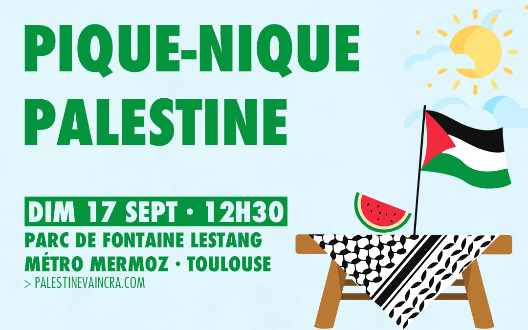 Le Collectif Palestine Vaincra vous invite à son pique-nique de rentrée au Parc de Fontaine Lestang (métro Mermoz – Toulouse) ce dimanche 17 septembre dès 12H30. L’occasion de se rencontrer, passer un moment convivial et discuter des activités à venir en soutien au peuple palestinien. Au programme : auberge espagnole, musique, jeux pour enfants, table d’infos…