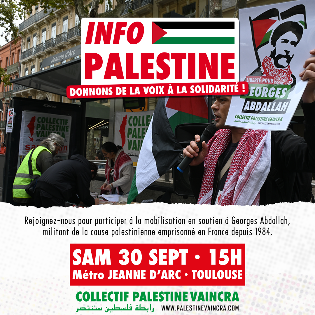 Samedi 30 septembre de 15H à 17H à la sortie du métro Jeanne d’Arc à Toulouse, rejoignez notre Info-Palestine dans le cadre du mois international pour la libération de Georges Abdallah, militant de la cause palestinienne emprisonné en France depuis 39 ans. À cette occasion, nous distribuerons de nombreux flyers et afficherons notre solidarité avec celui qui est devenu le plus ancien prisonnier politique d’Europe. Rejoignez-nous !