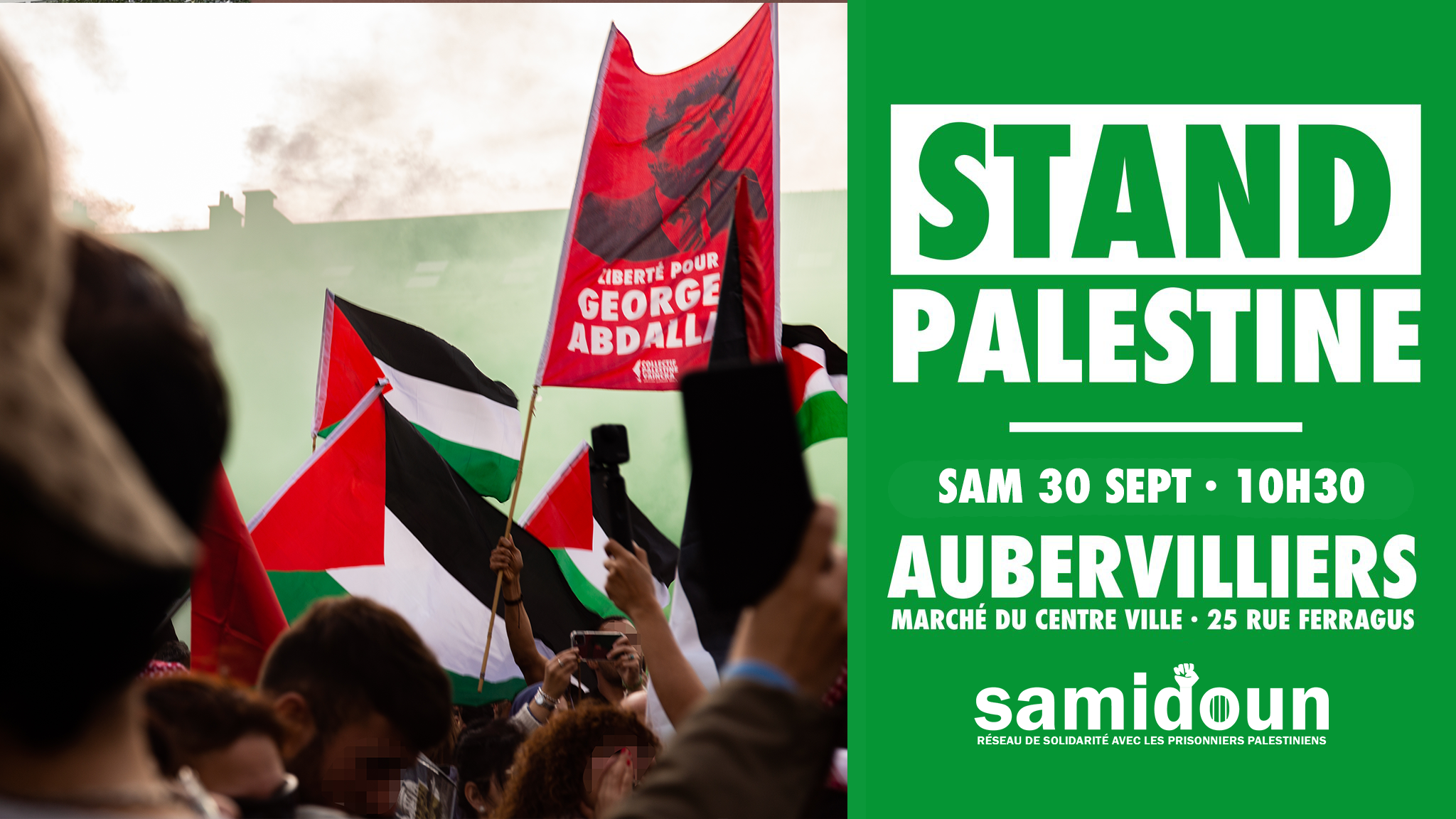 Samedi 30 septembre de 10H30 à 12H30, Samidoun Paris Banlieue vous invite à son stand de solidarité avec la Palestine au marché du centre-ville d’Aubervilliers (25 rue Ferragus). Celui-ci s’inscrit dans le cadre du mois international de mobilisation pour la libération de Georges Abdallah.