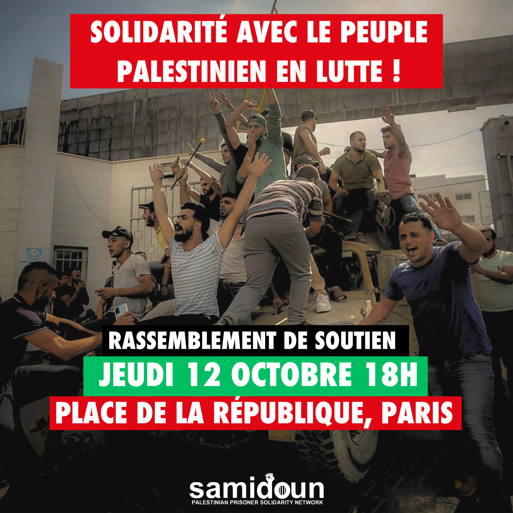 Samidoun PB invite toutes les organisations et personnes solidaires du peuple palestinien en lutte et sa résistance à rejoindre l’initiative d’Europalestine et du CNPJDPI et à se rassembler le jeudi 12 octobre dès 18h place de la République ! Des initiatives de soutien à la résistance palestinienne se multiplient partout dans le monde, faisons en sorte que l’Ile de France soit à la hauteur !