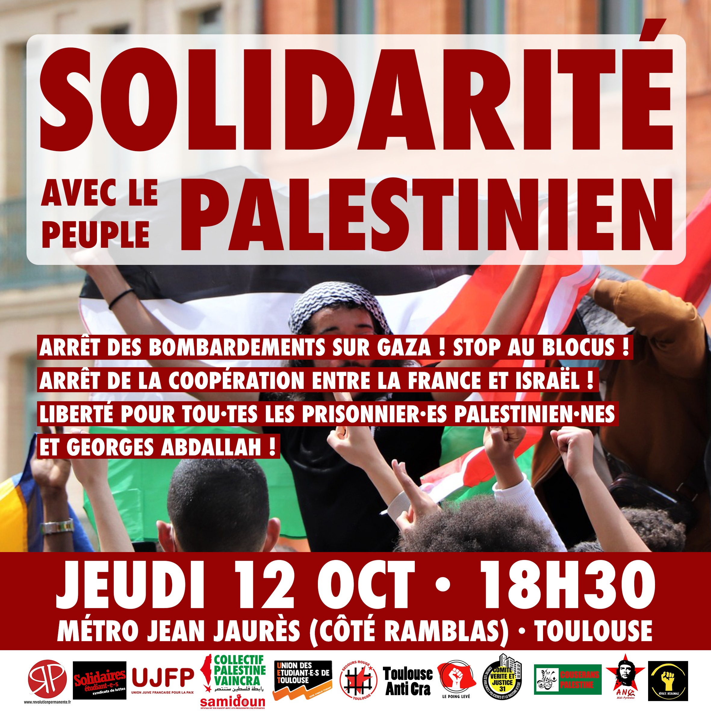 Associations, syndicats et partis politiques appellent à se rassembler à Toulouse en solidarité avec le peuple palestinien le jeudi 12 octobre dès 18H30 au métro Jean Jaurès (côté ramblas). À cette occasion, nous revendiquerons :