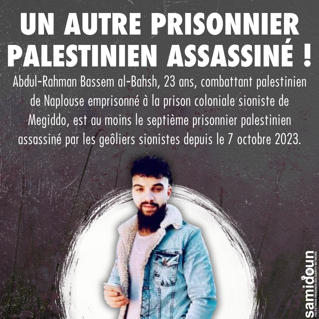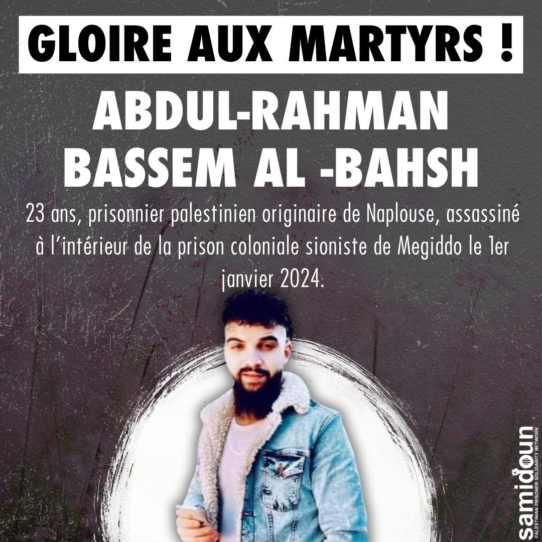 À l’aube de la nouvelle année 2024, en plein génocide sioniste en Palestine occupée – et au moment où la résistance héroïque affronte la machine de guerre de l’occupation – les forces d’occupation israéliennes poursuivent leur guerre contre les prisonniers palestiniens et leur mouvement. Le 1er janvier 2024, un prisonnier de 23 ans, Abdul-Rahman Bassem Al-Bahsh, a été assassiné par les forces de l’occupation à l’intérieur de la prison coloniale sioniste de Megiddo.