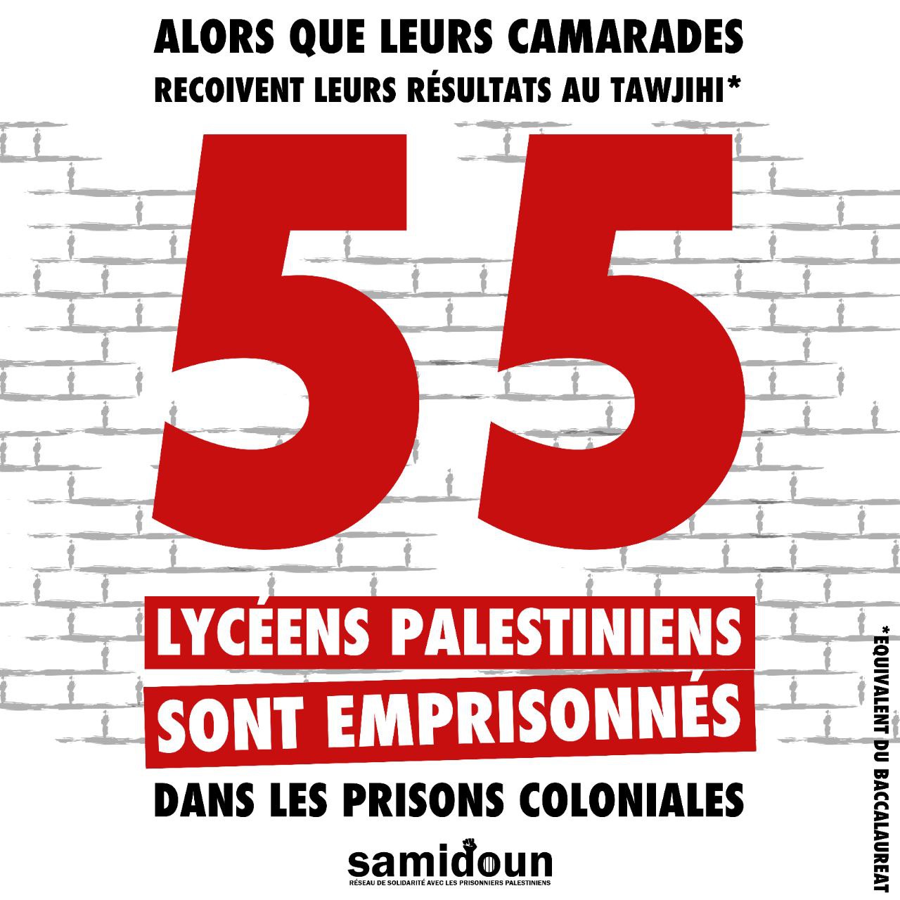 Dans les prisons coloniales c’est 55 lycéens palestiniens qui sont détenus et qui sont donc privés de la possibilité de passer leur diplôme.