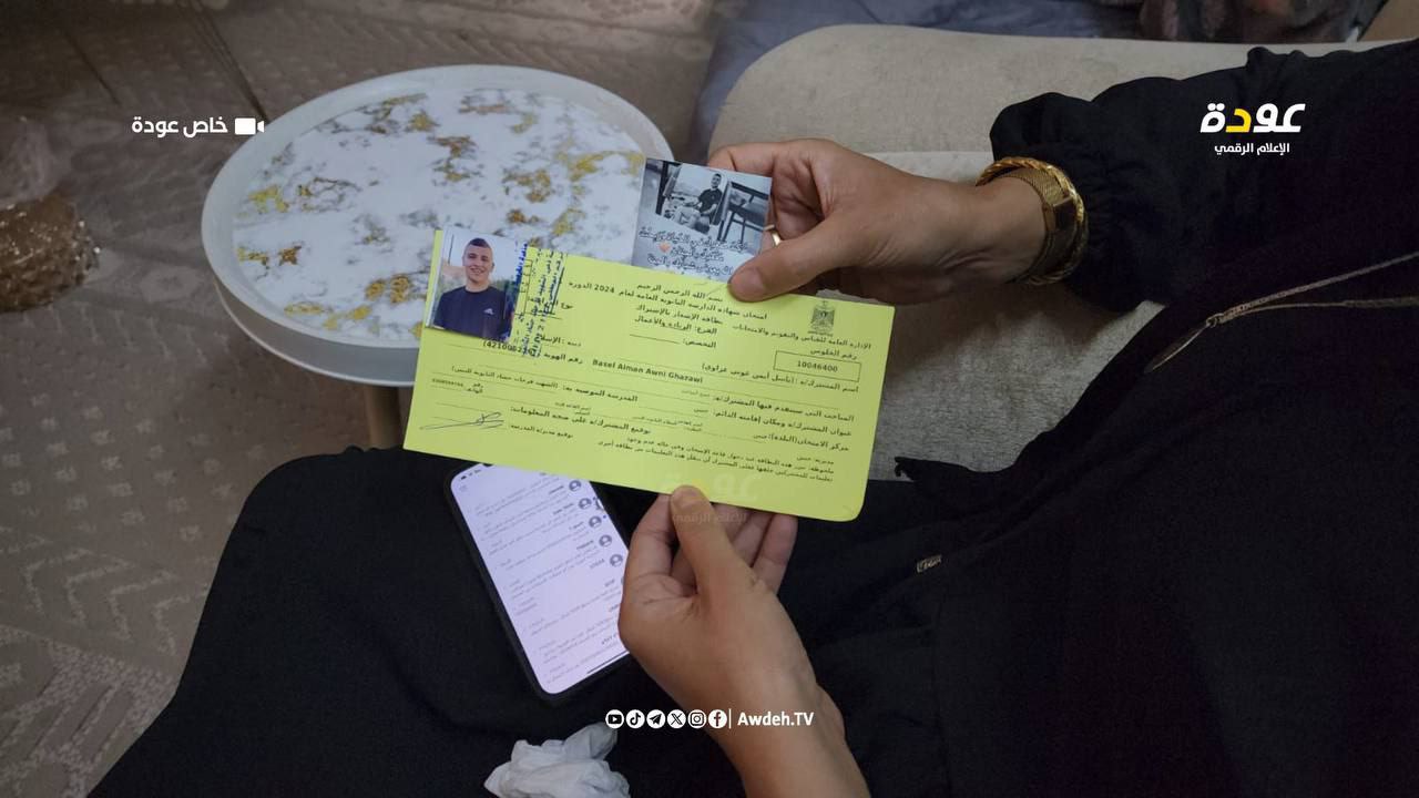 Les familles des martyrs se recueillent sur les tombes ou chez elles, se consolant en regardant avec amour les photos et portraits des êtres chers qui reposent sur les murs. Comme la maman de Basil Ayman Al-Ghazawi du camp de Jénine, qui a été privé de la joie de réussir au lycée par l’occupation après avoir été assassiné avec son frère Muhammad à l’hôpital Ibn Sina par l’armée sioniste.