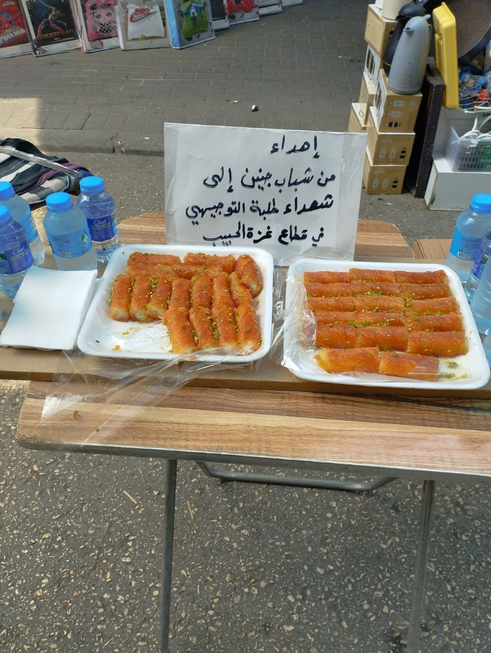 Les camarades des lycéens tombés martyrs, parfois les armes à la main, défendant leur camp face à l’armée sioniste, honorent leurs mémoires en offrant des friandises et de l’eau aux habitants.