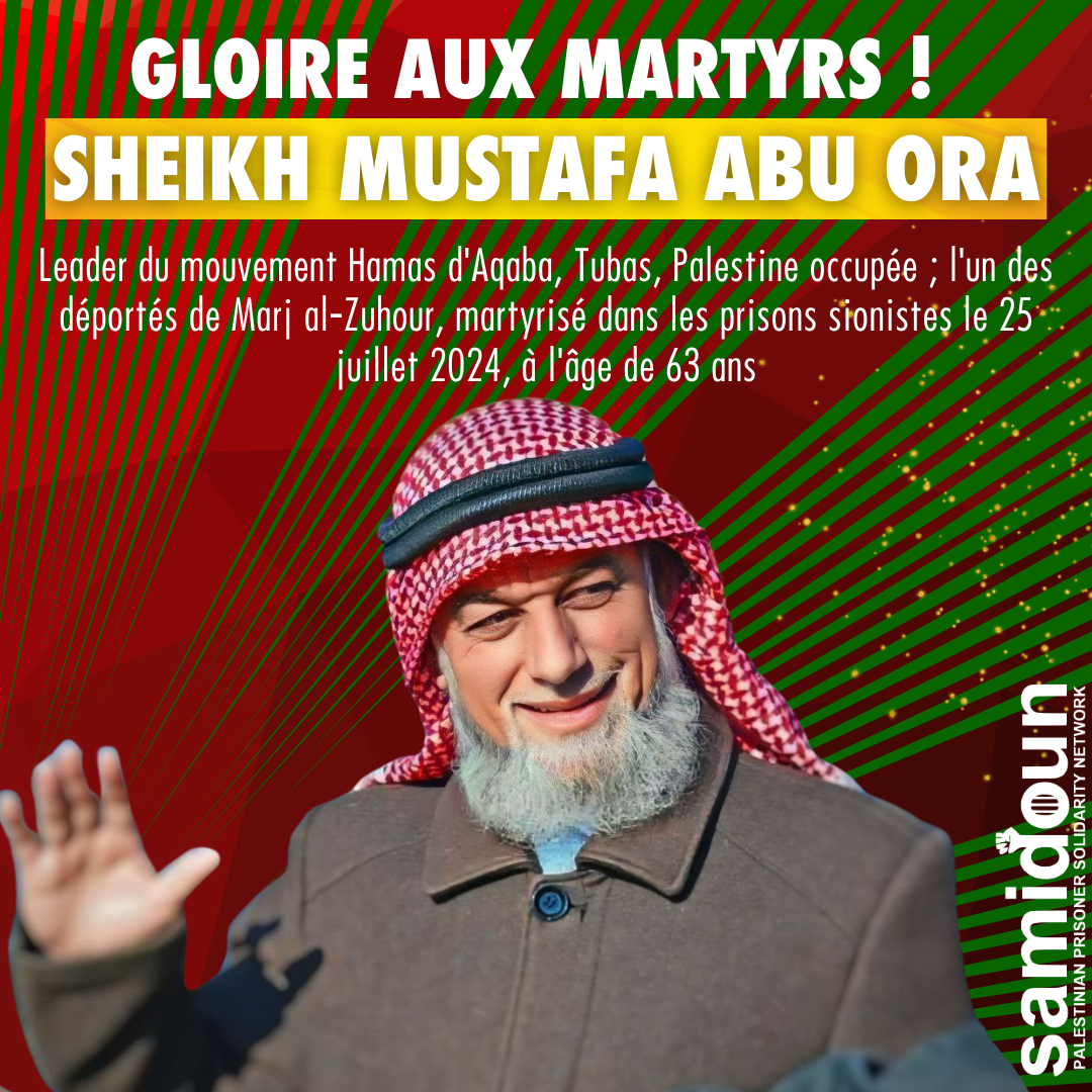Cheikh Mustafa Abu Ora, 63 ans, l’un des leader du Hamas en Cisjordanie , originaire d’Aqaba, Tubas , est tombé martyr, assassiné dans les prisons sionistes alors qu’il était en détention administrative.