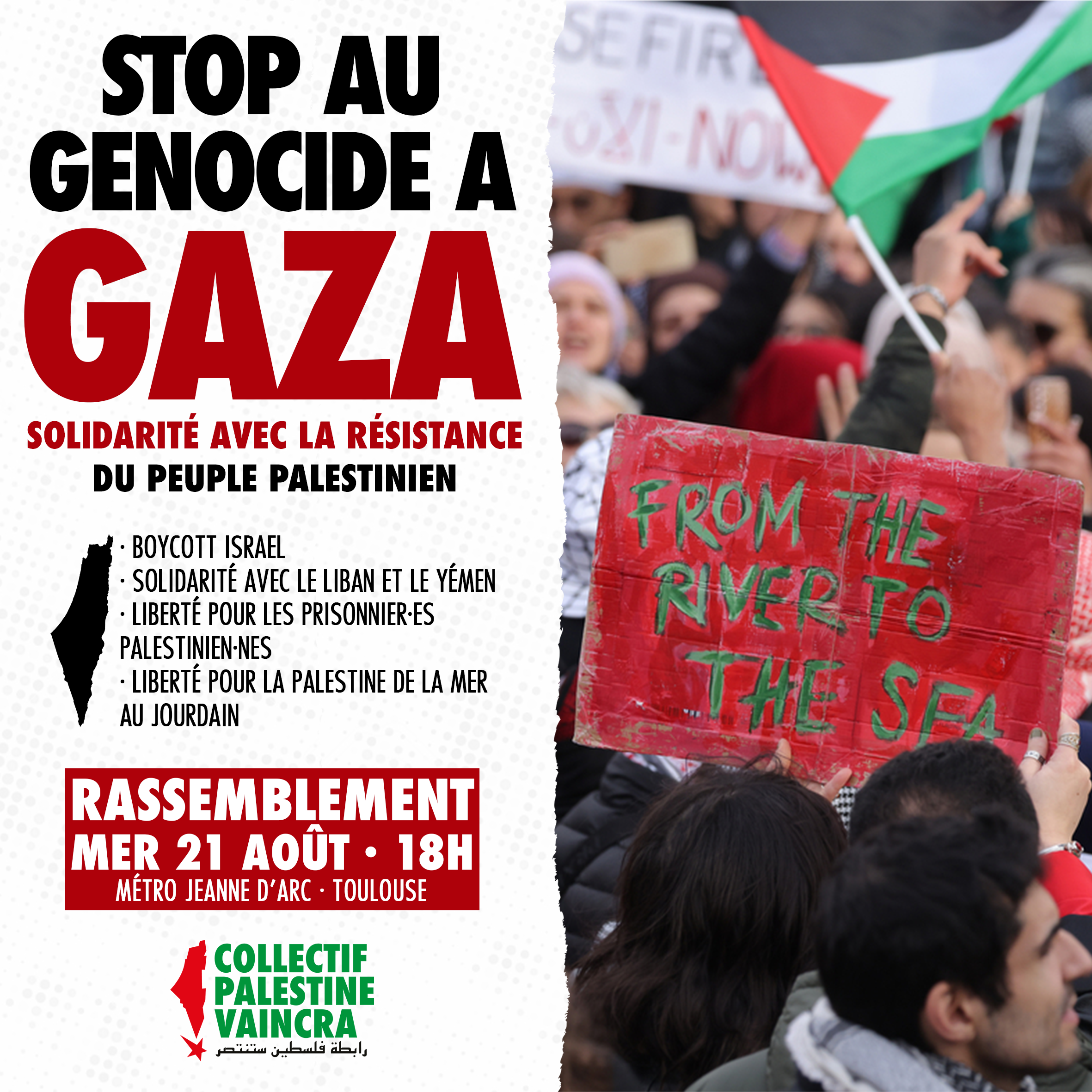 À 10 mois de génocide ont répondu 10 mois de résistance incessante et résolue à Gaza, dans toute la Palestine et partout dans le monde. Plus que jamais, tenons-nous au côté du peuple palestinien dans sa lutte contre l’opération génocidaire en cours et plus de 76 ans de colonisation de peuplement de sa terre. Rassemblons-nous le mercredi 21 août à 18H au métro Jeanne d’Arc à Toulouse pour affirmer haut et fort que nous n’abandonnerons pas la Palestine !