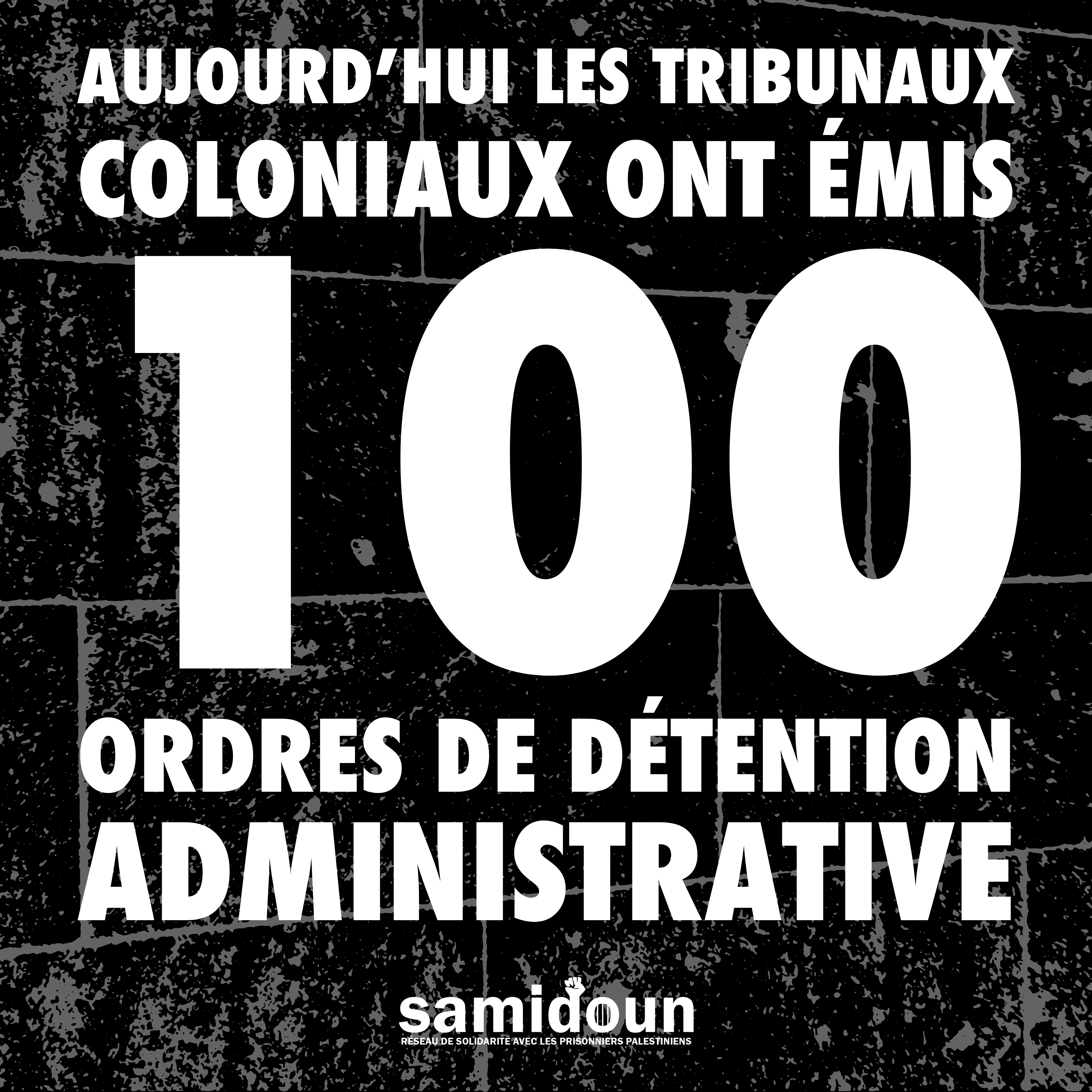Le réseau international de solidarité avec les prisonnier•es palestinien•nes, Samidoun, souligne que les puissances impérialistes qui continuent de financer, d’armer et de fournir une couverture militaire, diplomatique et politique à l’occupation sont pleinement complices de l’emprisonnement massif du peuple palestinien, tout comme elles sont activement complices du génocide en cours actuellement à Gaza. Nous appelons tous•tes les partisans de la Palestine et les communautés palestiniennes mobilisées à agir, à se mobiliser, à manifester et à organiser des actions directes pour faire face à la machine de guerre impérialiste-sioniste et exiger la fin de la détention administrative, la libération de tous•tes les détenu•es administratif•ves et la libération de tous•tes les prisonnier•es palestinien•nes dans les prisons sionistes, impérialistes, les prisons de l’AP et des régimes réactionnaires. La lutte pour la libération des prisonnier•es est une partie intégrante de la lutte pour la libération de la Palestine, toute la Palestine, de la Mer au Jourdain.