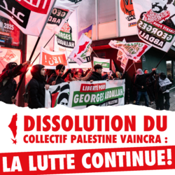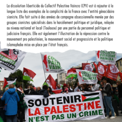 La dissolution liberticide du Collectif Palestine Vaincra (CPV) est à rajouter à la longue liste des exemples de la complicité de la France avec l’entité génocidaire sioniste. Elle fait suite à des années de campagne obsessionnelle menée par des groupes sionistes spécialisés dans le harcèlement politique et juridique, relayée au niveau national et local (Toulouse) par une partie du personnel politique et judiciaire français. Elle est également l’illustration de la répression contre le mouvement pro palestinien, le mouvement social et progressiste et la politique islamophobe mise en place par l’état français.