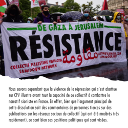 Nous savons cependant que la violence de la répression qui s’est abattue sur CPV illustre avant tout la capacité de ce collectif à combattre le narratif sioniste en France. En effet, bien que l’argument principal de cette dissolution soit des commentaires de personnes tierces sur des publications sur les réseaux sociaux du collectif (qui ont été modérés très rapidement), ce sont bien ses positions politiques qui sont visées.