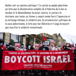 Quelles sont ces opinions politiques ? Le soutien au peuple palestinien qui lutte pour la décolonisation complète de la Palestine de la mer au Jourdain et le démantèlement du projet sioniste, le soutien à la résistance sous toutes ces formes y compris armée face à l’oppression et au nettoyage ethnique, la solidarité avec les prisonnier·ère·s politiques de la cause palestinienne, la lutte pour leur libération et l’usage du boycott pour massifier la solidarité internationale.