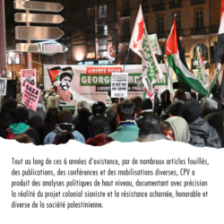 Tout au long de ces 6 années d’existence, par de nombreux articles fouillés, des publications, des conférences et des mobilisations diverses, CPV a produit des analyses politiques de haut niveau, documentant avec précision la réalité du projet colonial sioniste et la résistance acharnée, honorable et diverse de la société palestinienne.