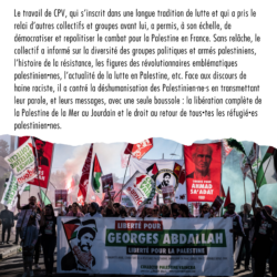 Le travail de CPV, qui s’inscrit dans une longue tradition de lutte et qui a pris le relai d’autres collectifs et groupes avant lui, a permis, à son échelle, de démocratiser et repolitiser le combat pour la Palestine en France. Sans relâche, le collectif a informé sur la diversité des groupes politiques et armés palestiniens, l’histoire de la résistance, les figures des révolutionnaires emblématiques palestinien•nes, l’actualité de la lutte en Palestine, etc. Face aux discours de haine raciste, il a contré la déshumanisation des Palestinien·ne·s en transmettant leur parole, et leurs messages, avec une seule boussole : la libération complète de la Palestine de la Mer au Jourdain et le droit au retour de tous•tes les réfugié•es palestinien•nes.