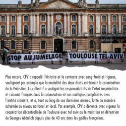 Plus encore, CPV a rappelé l’histoire et le contexte avec sang-froid et rigueur, soulignant par exemple que la modalité des deux états entérinait la colonisation de la Palestine. Le collectif a souligné les responsabilités de l’état impérialiste et colonial français dans la colonisation et ses multiples complicités avec l’entité sioniste, et a, tout au long de ses dernières années, lutté de manière acharnée au niveau national et local. Par exemple, CPV a dénoncé avec vigueur la coopération décentralisée de Toulouse avec tel aviv ou le maintien en détention de Georges Abdallah depuis plus de 40 ans dans les geôles françaises.