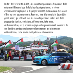 Du fait de l’efficacité de CPV, des intérêts impérialistes français et de la nature antidémocratique de la loi sur les séparatismes, le niveau d’acharnement déployé et la disproportionnalité de la décision du Conseil d’Etat ne sont pas surprenants. Pourtant, face à la complicité des médias grand public, qui utilisent tous les ressorts possibles (relais brut de la propagande sioniste, omissions, diffamations, fake news, déshumanisation, etc.), et dans un pays où les gouvernement successifs de ces dernières années amalgament volontairement antisionisme et antisémitisme, cette parole était précieuse et nécessaire.
