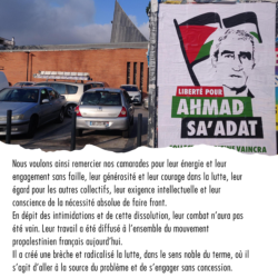 Nous voulons ainsi remercier nos camarades pour leur énergie et leur engagement sans faille, leur générosité et leur courage dans la lutte, leur égard pour les autres collectifs, leur exigence intellectuelle et leur conscience de la nécessité absolue de faire front. En dépit des intimidations et de cette dissolution, leur combat n’aura pas été vain. Leur travail a été diffusé à l’ensemble du mouvement propalestinien français aujourd’hui. Il a créé une brèche et radicalisé la lutte, dans le sens noble du terme, où il s’agit d’aller à la source du problème et de s’engager sans concession.
